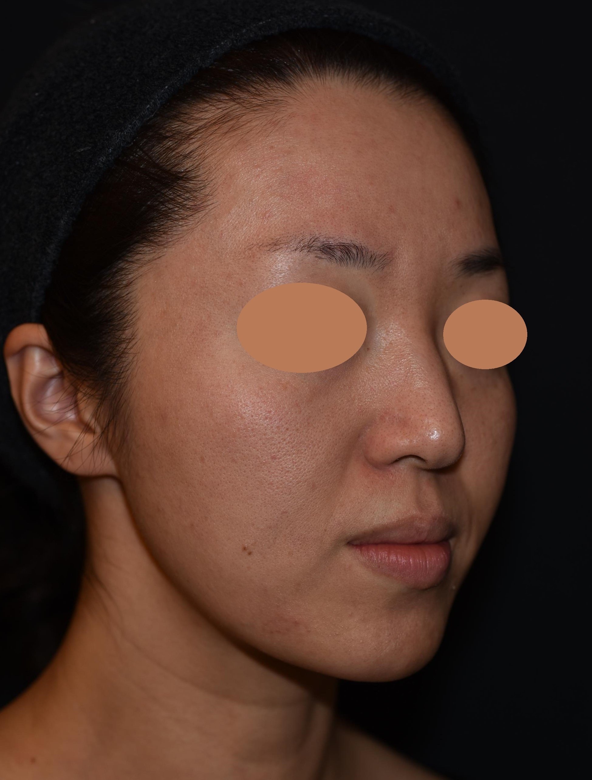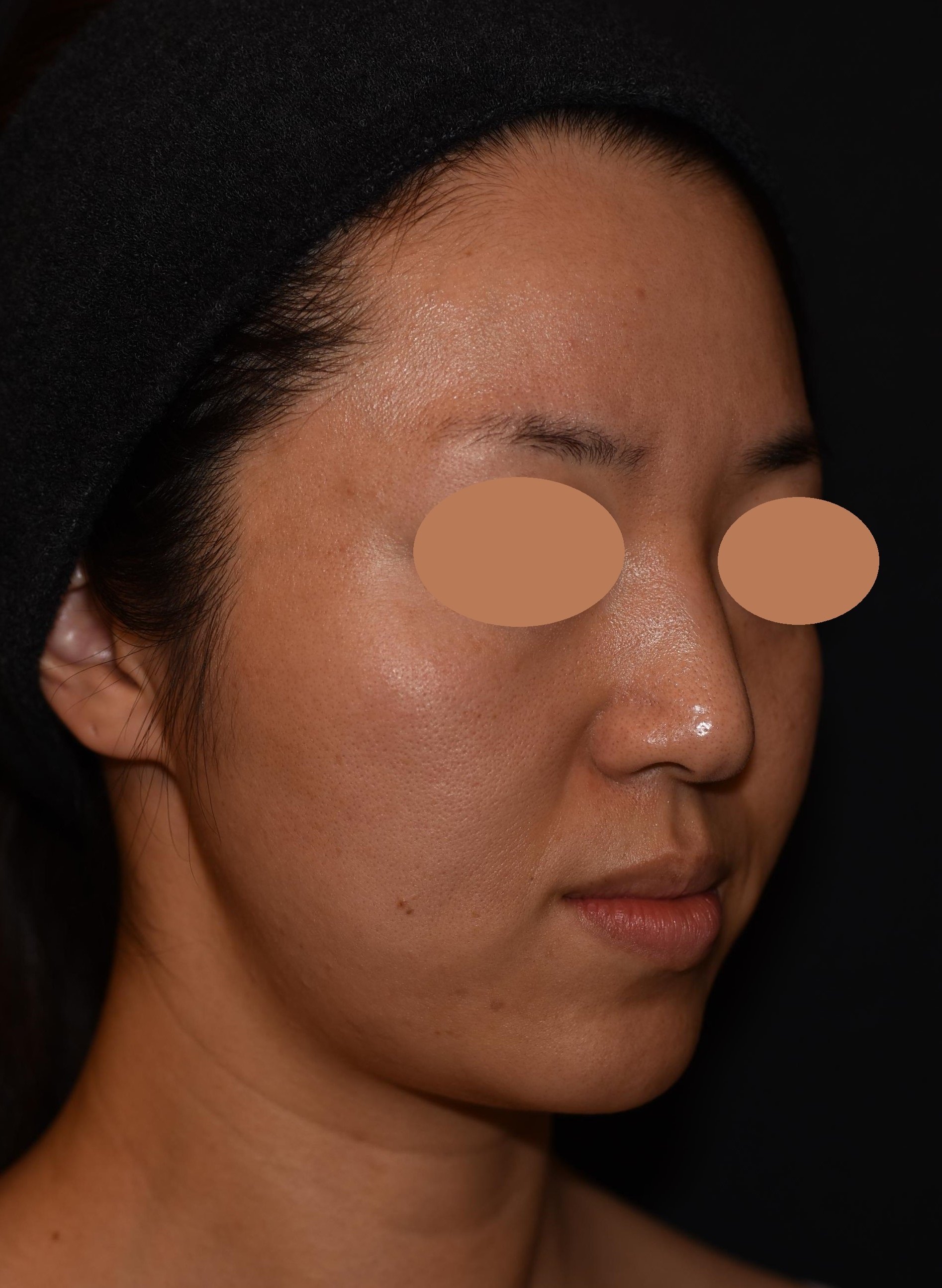 あご下のだぶつきが引き締まって輪郭がはっきりしたことで顔と首の境界線がはっきりしました。頬全体が引き締まり、ほうれい線やマリオネットラインも浅くなっています。また、頬の毛穴の開きも目立たなくなりました。