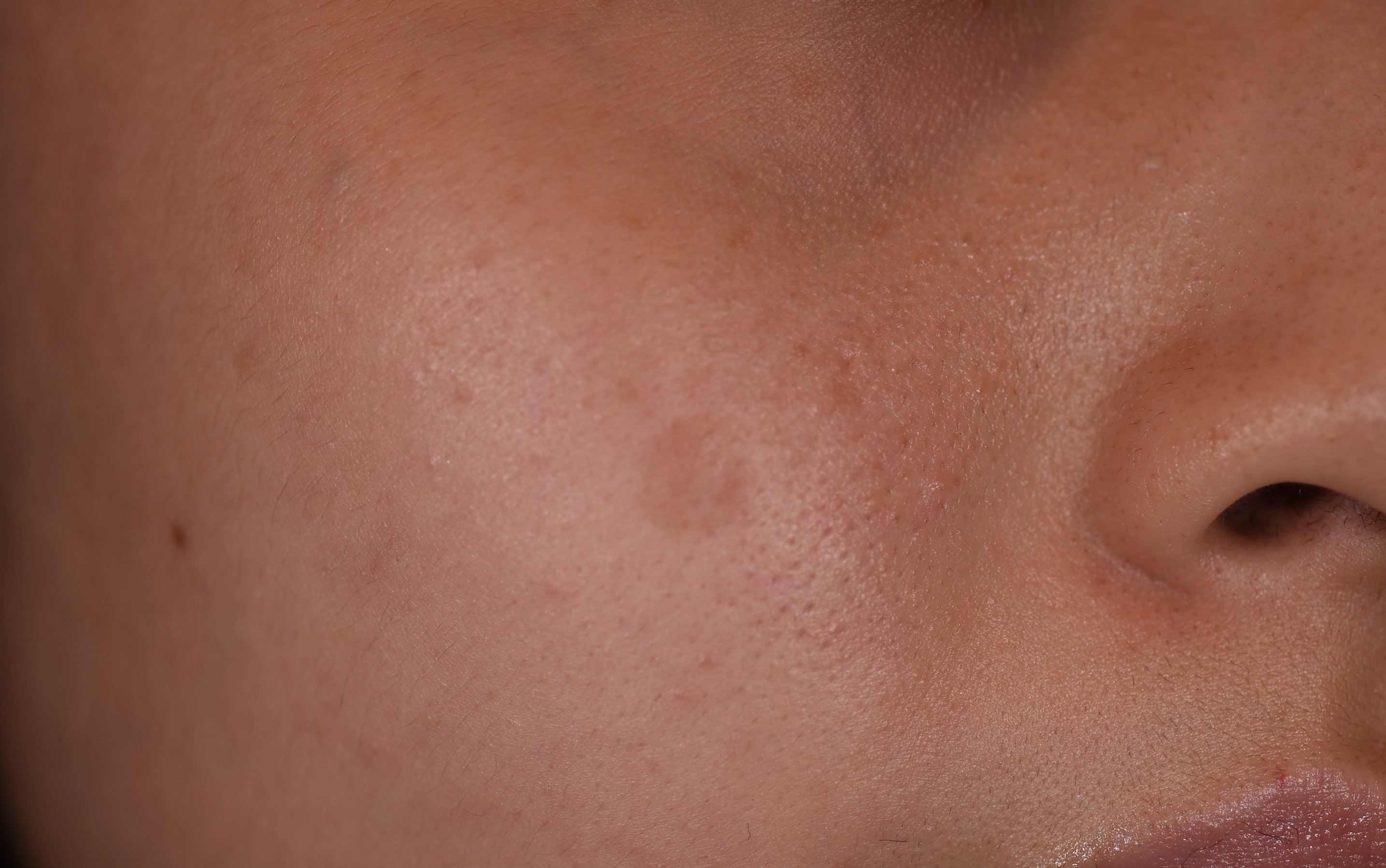 右頬のシミが目立っていました。スポット照射後の経過写真です。施術2日後は、照射箇所の色が濃くなっています。その後、薄い膜状のかさぶたが形成され、約1週間で自然に剥がれ落ちました。1ヶ月後にはシミがキレイに取れて、肌の印象が変わっています。ご本人もコンシーラーで隠す手間がなくなり、メイクが楽になったと喜ばれていました。 ピコスポット照射は、余計な熱発生がないので、皮膚へのダメージが少なく、照射後もテープ保護が不要で軟膏を塗るだけの簡単なケアになります。