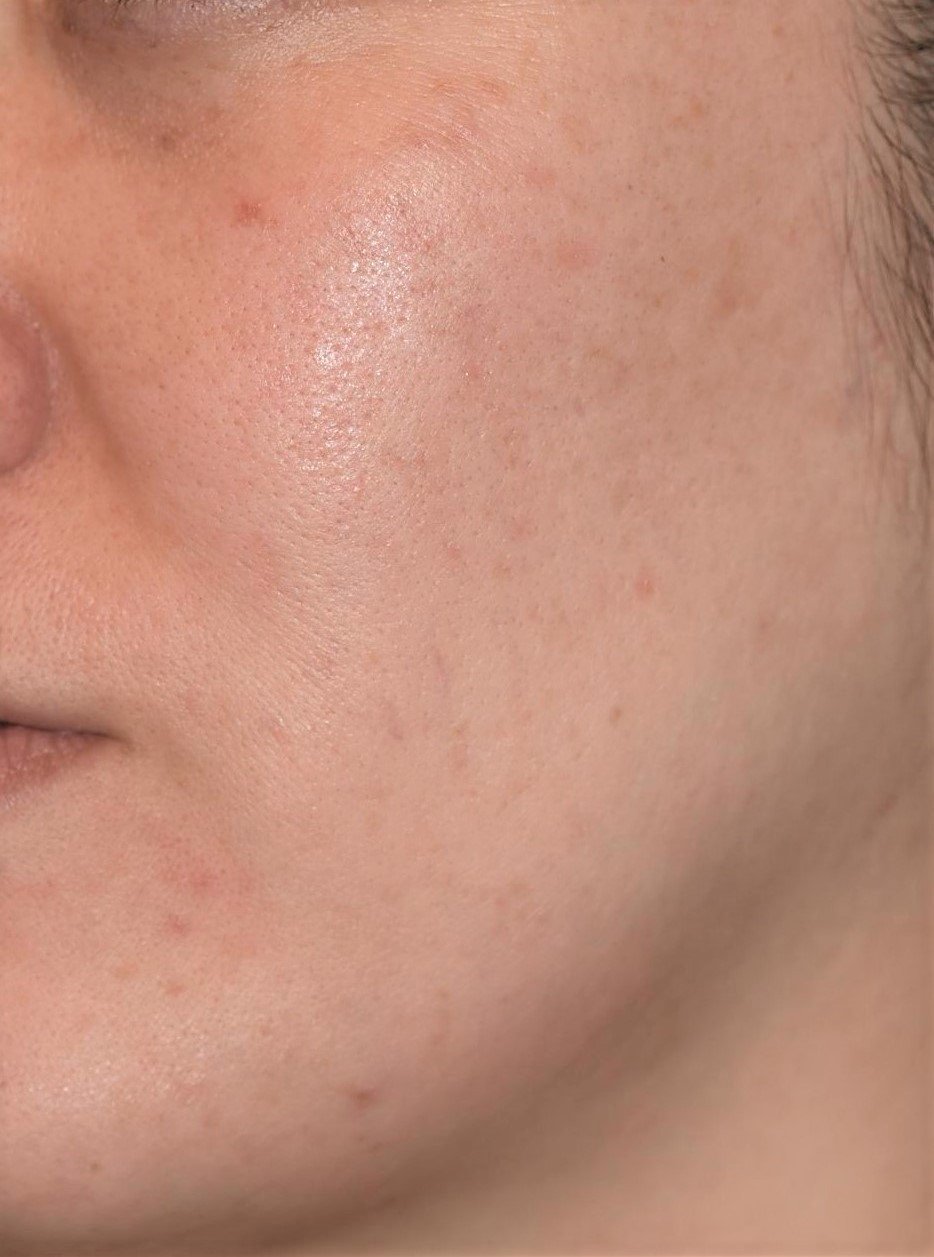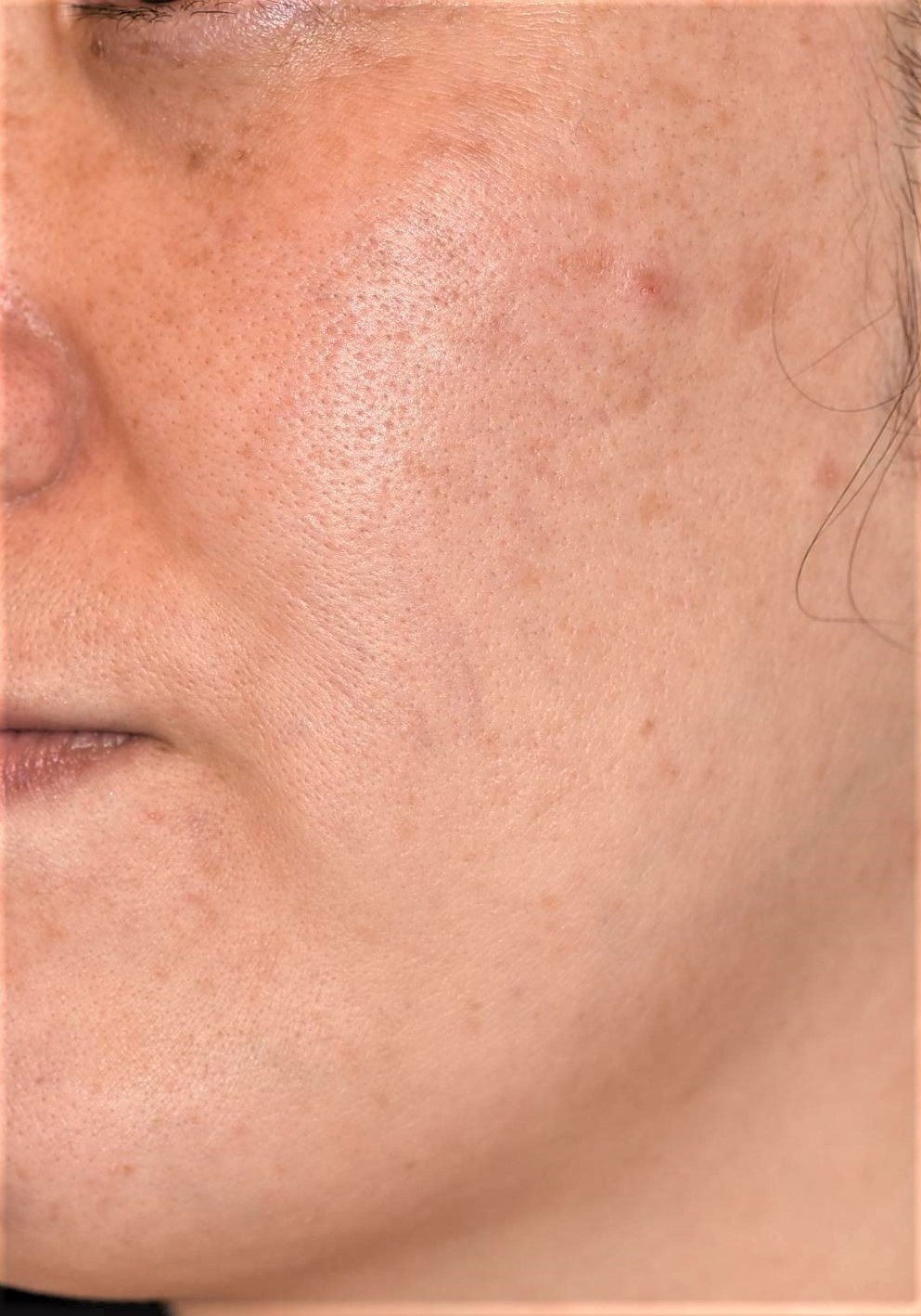 顔全体に、雀卵斑(そばかす)と日光性色素斑が混在していました。照射2週間後の淡い赤みは、新しく生まれ変わった肌の透明感によるものです。ご自宅では美白内服と美白剤のアフターケアをきちんと継続いただけたので、炎症後色素沈着はほとんど生じず、照射1ヶ月半後には周囲の皮膚に馴染んでいます。肌の質感も改善して、ハリとツヤが増しました。
