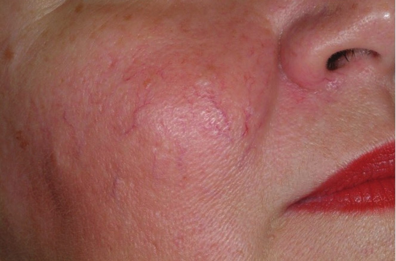 フォトフェイシャルM22のVascular Treatment Filter(血管専用フィルター)は、浅い部分にある血管と深い部分にある血管の両方に作用します。赤みが改善し肌のトーンが全体的に均一になりました。ミミズ状の毛細血管拡張には、高出力部分照射を追加しています。