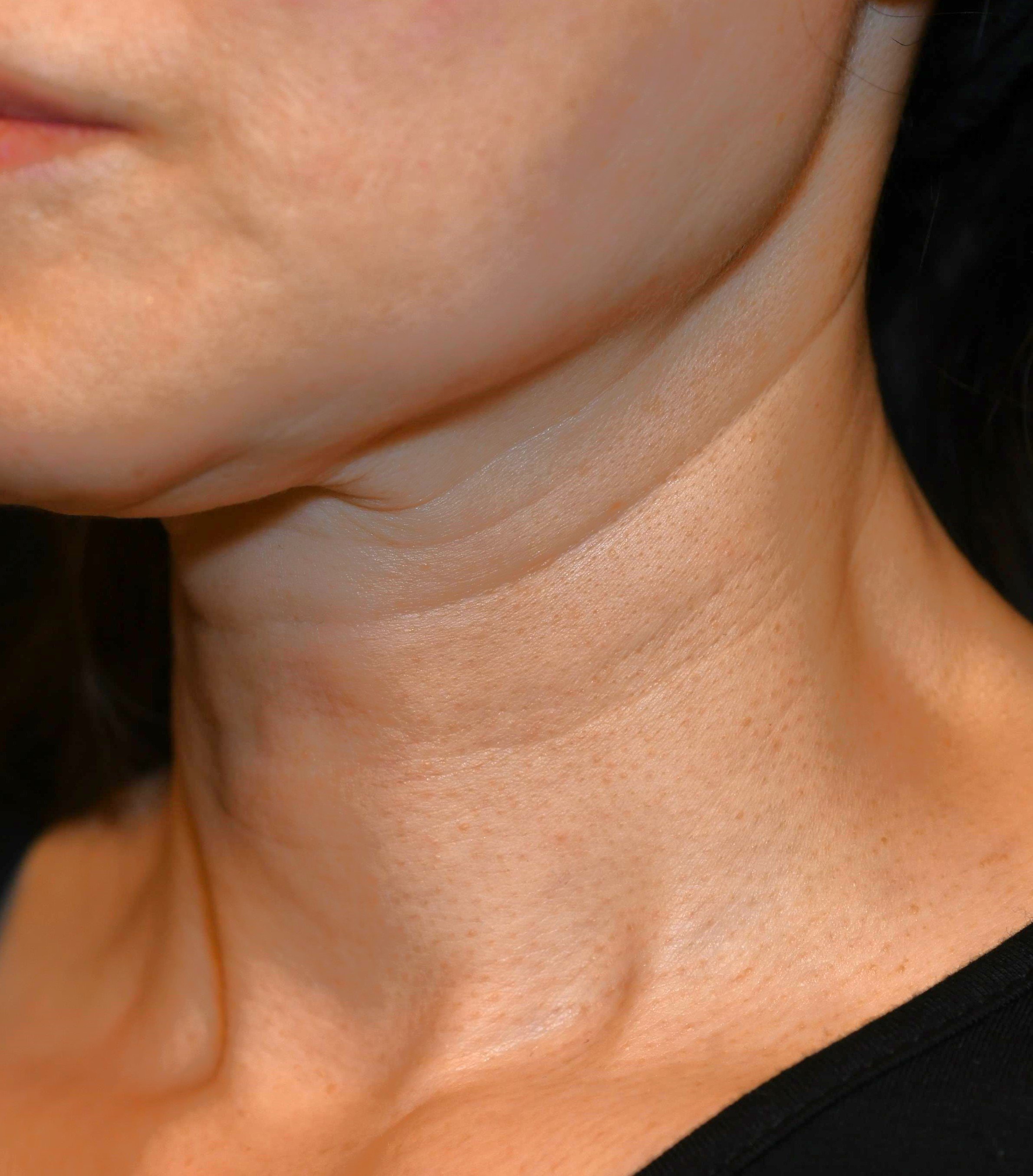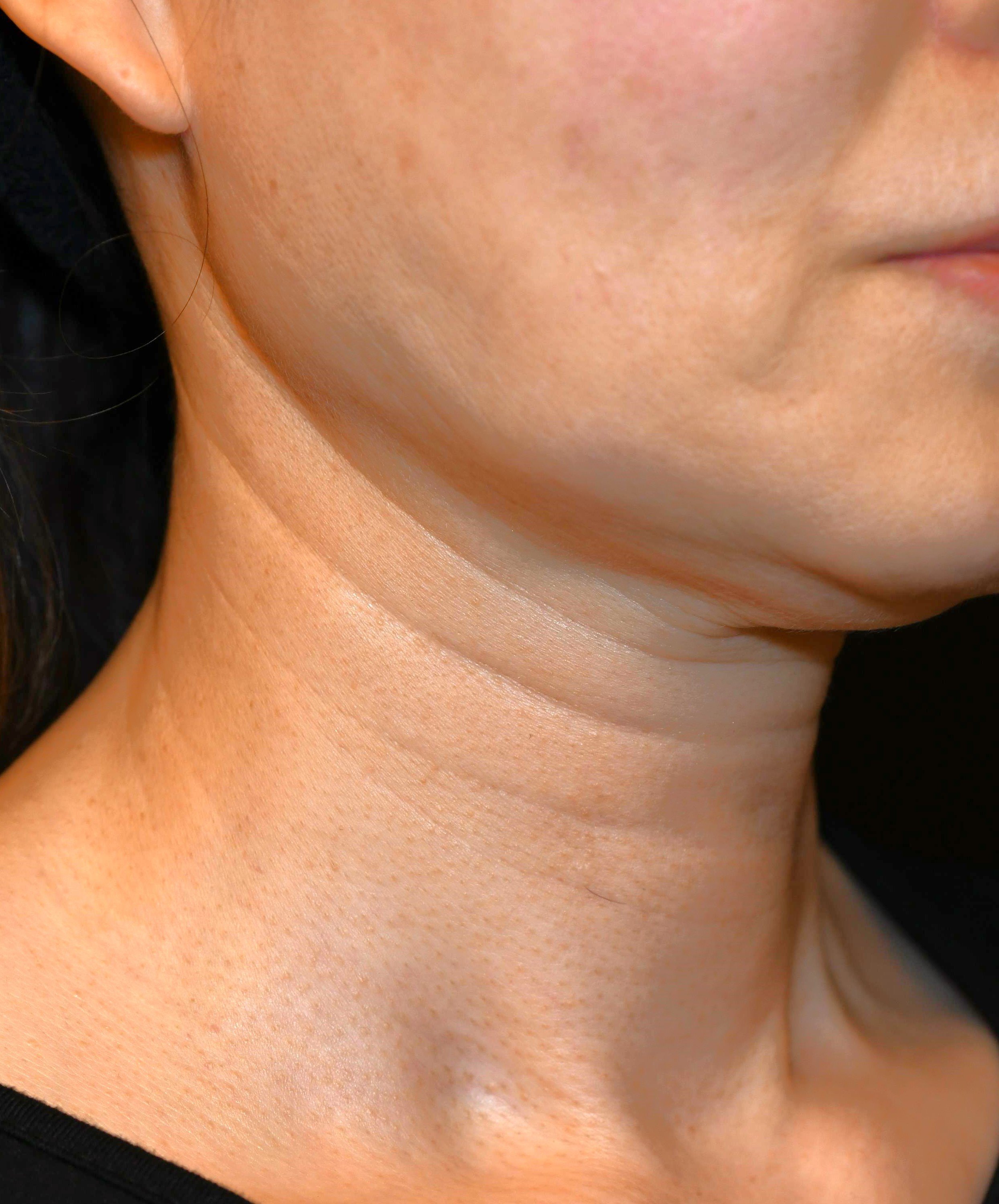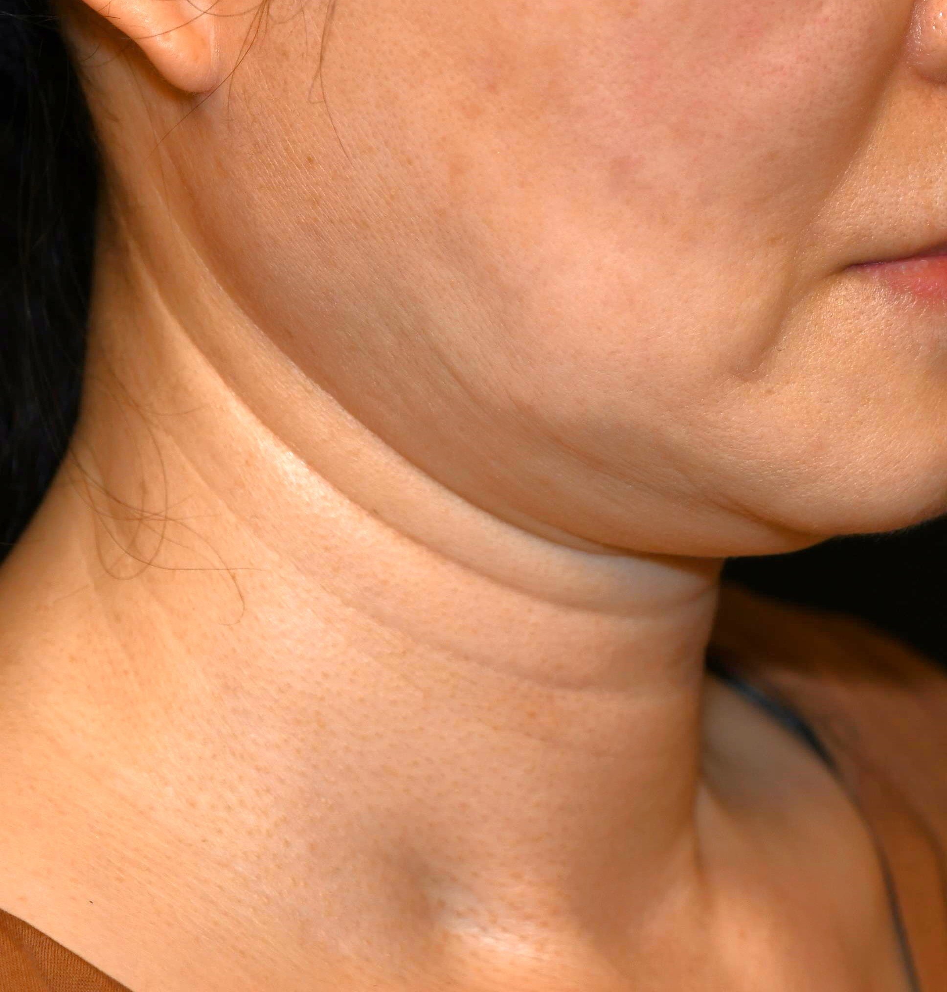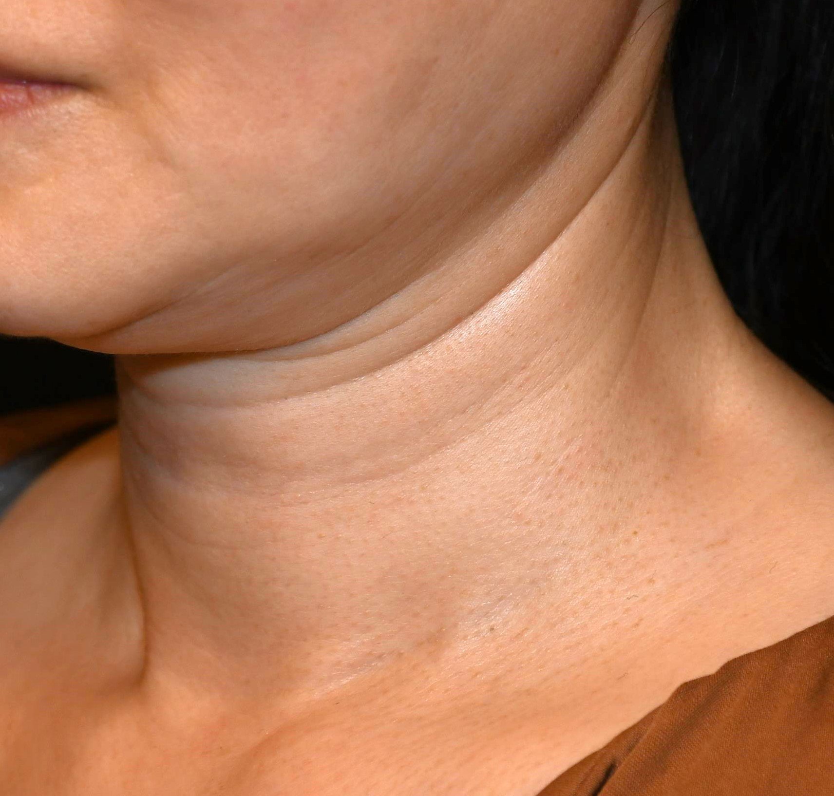 首のシワが出来る原因は、たるみ、皮膚萎縮、広頚筋の過緊張など複合的です。この方は皮膚が柔らかく、たるみによる深いシワが刻まれているため、プロファイロ注入を行いました。輪郭のもたつきとたるみが軽減しているのが分かります。首のシワは治療が難しい部位ですが、根気よく治療すると結果がきちんと得られます。