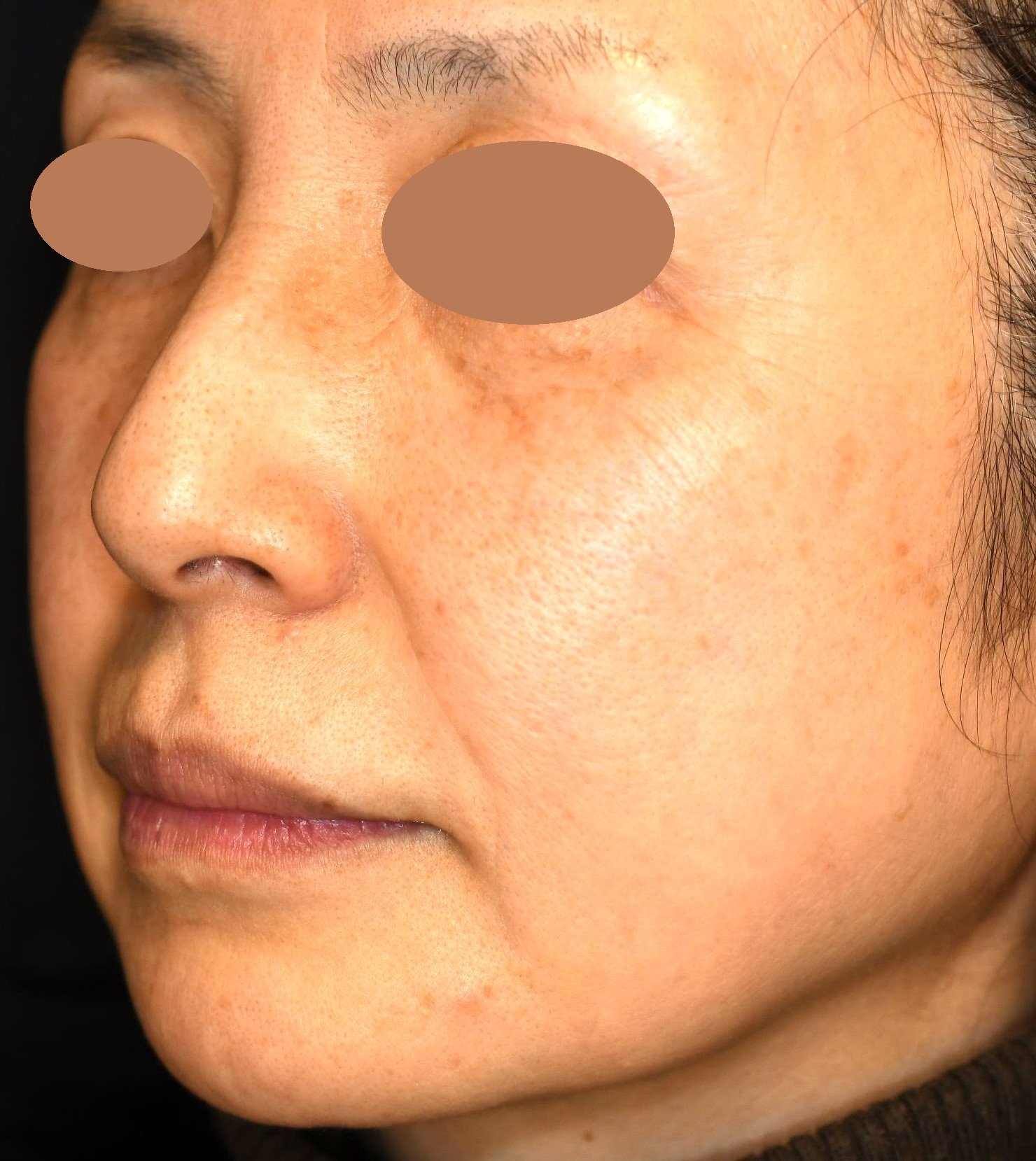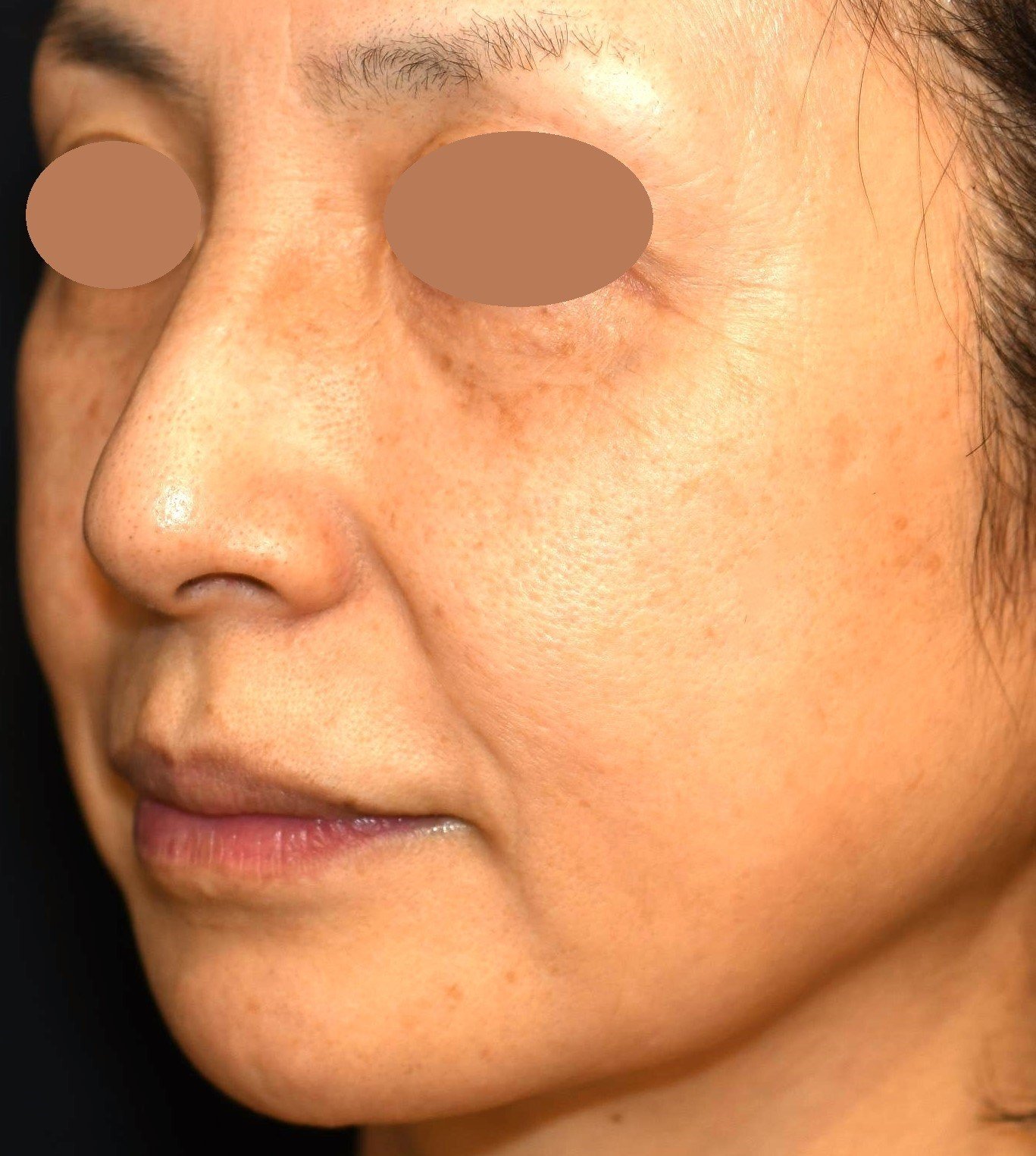 口角横~口角下のちょこっとしたシワは、なかなか治療が難しい部位です。下手な層に入れると口元がだぶついて、かえってたるみが目立つこともあります。こちらの患者様には、ほうれい線下方、口角内側、頬骨下にヒアルロン酸を2本注入し、自然な若返り効果が得られました。笑顔を作った時の表情ジワも目立ちにくくなる、銀座ケイスキンクリニックが自信をもってご提供するサブシジョンテクニックで、副院長の伊勢医師が施術しました。