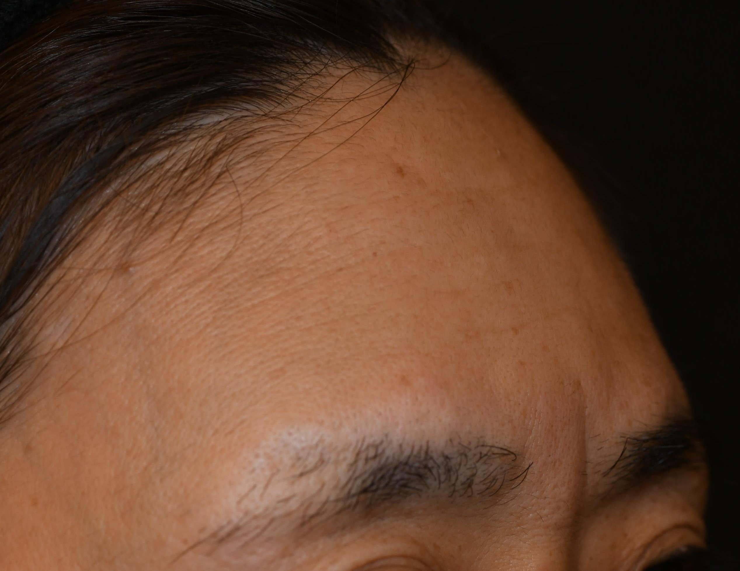 額が痩せて骨が目立つと老けて見えるばかりか、男性的な印象を与えてしまいます。また、緩くなった皮膚が動きやすくなるので、額のシワが目立ち、上まぶたもたるみやすくなってしまいます。こちらの患者様はこめかみの凹み、眉骨上の凹みが深く、2回に分けてヒアルロン酸を注入しました。シワが寄りにくくなり、若々しい印象に変わったと喜んでいただきました。