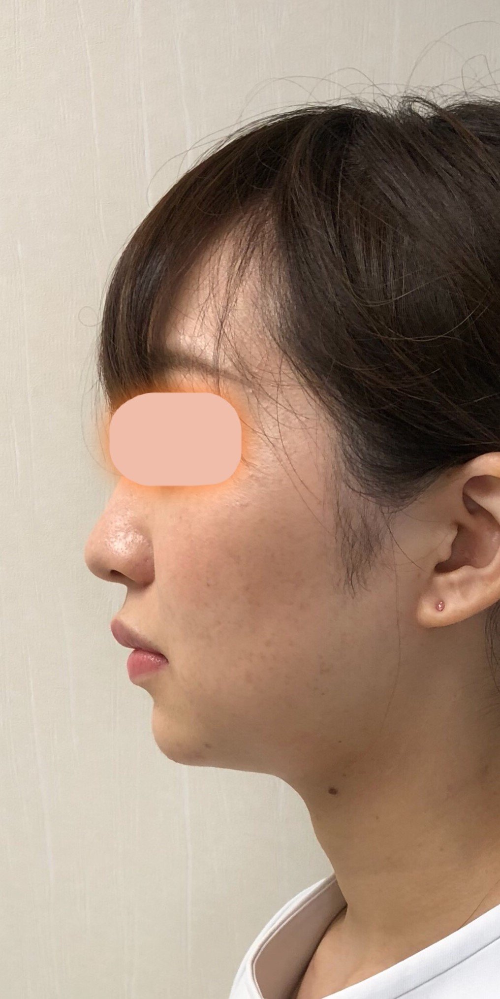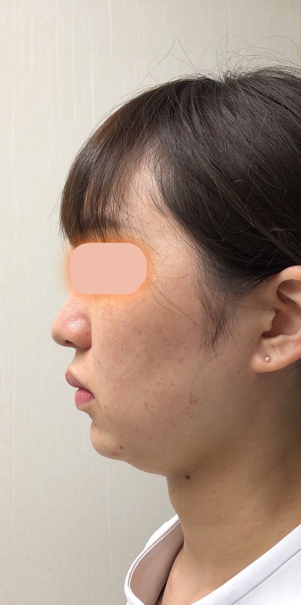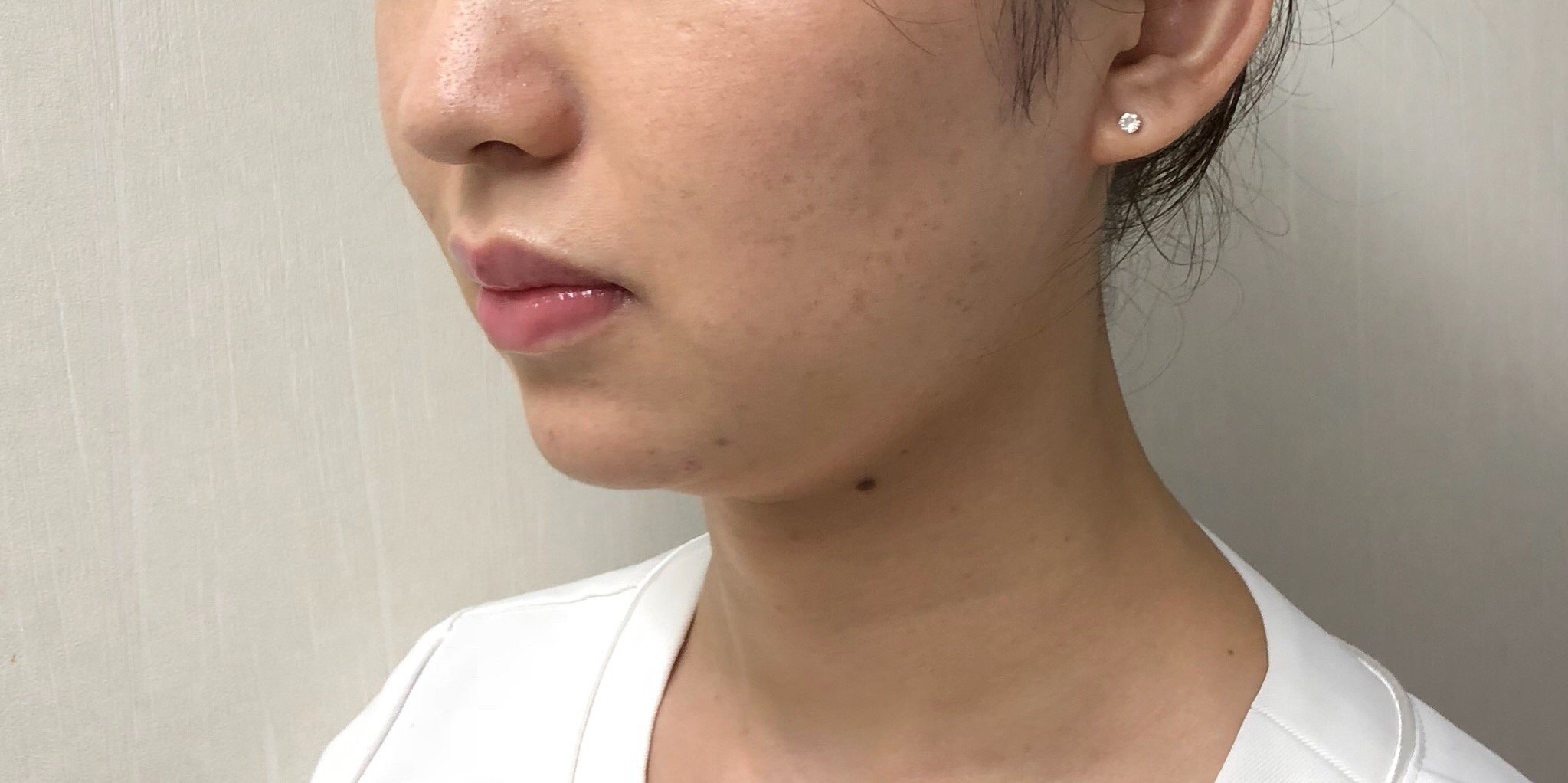 フェイスライン~あご下にかけて脂肪が増え下垂し、横から見ると二重顎が目立っていました。1回3ブロックを施術した2回目終了後から、脂肪が減少しているのが目に見えてわかるようになりました。4回目終了後には、もったりしていたフェイスラインの重みが取れて、輪郭がはっきりしました。二重あごも改善し、横顔も見違えるようスッキリしました。脂肪溶解注射後(2週間以内)に必ず受けていた『スマスアップ』のRF(高周波)とDMS(局所電気刺激)の相乗効果で、溶けた脂肪のデトックス作用が高まり、コラーゲンが新生され、より引き締まったシャープな印象になっています。