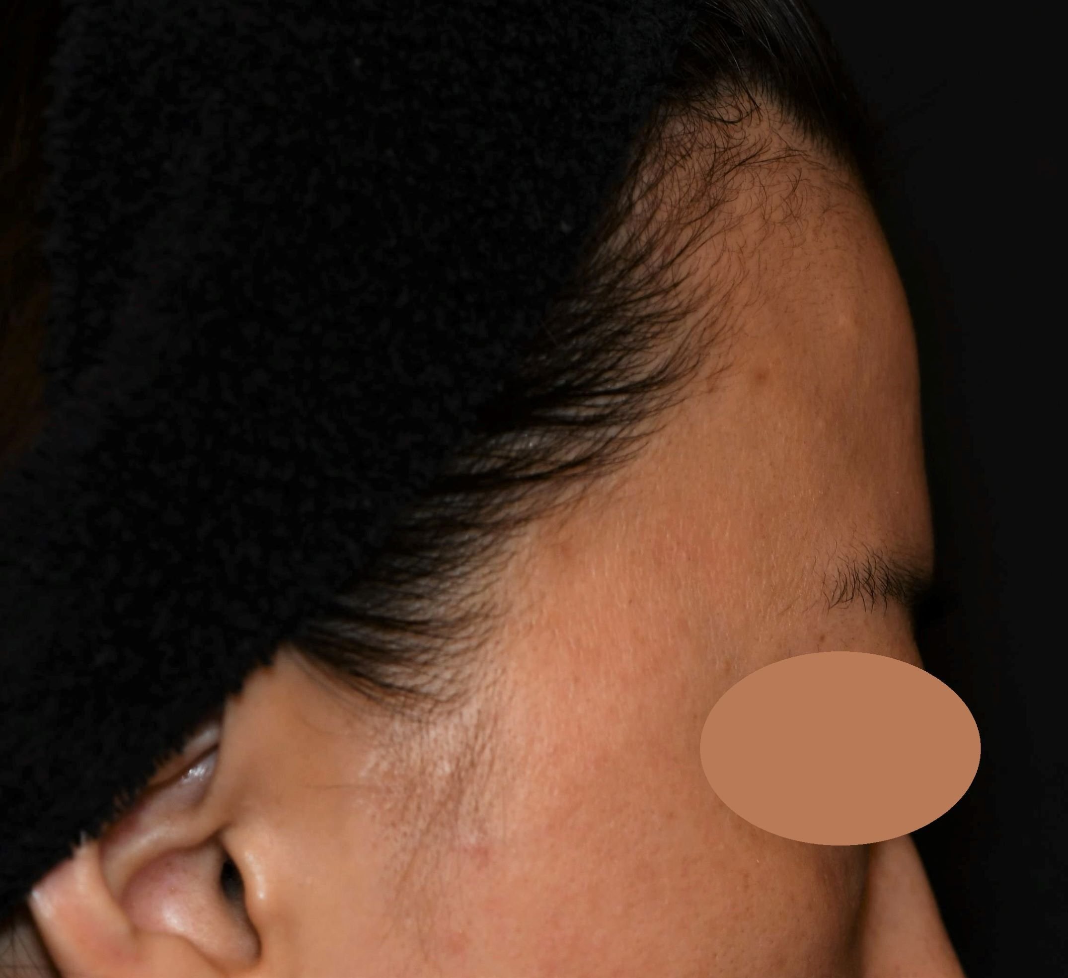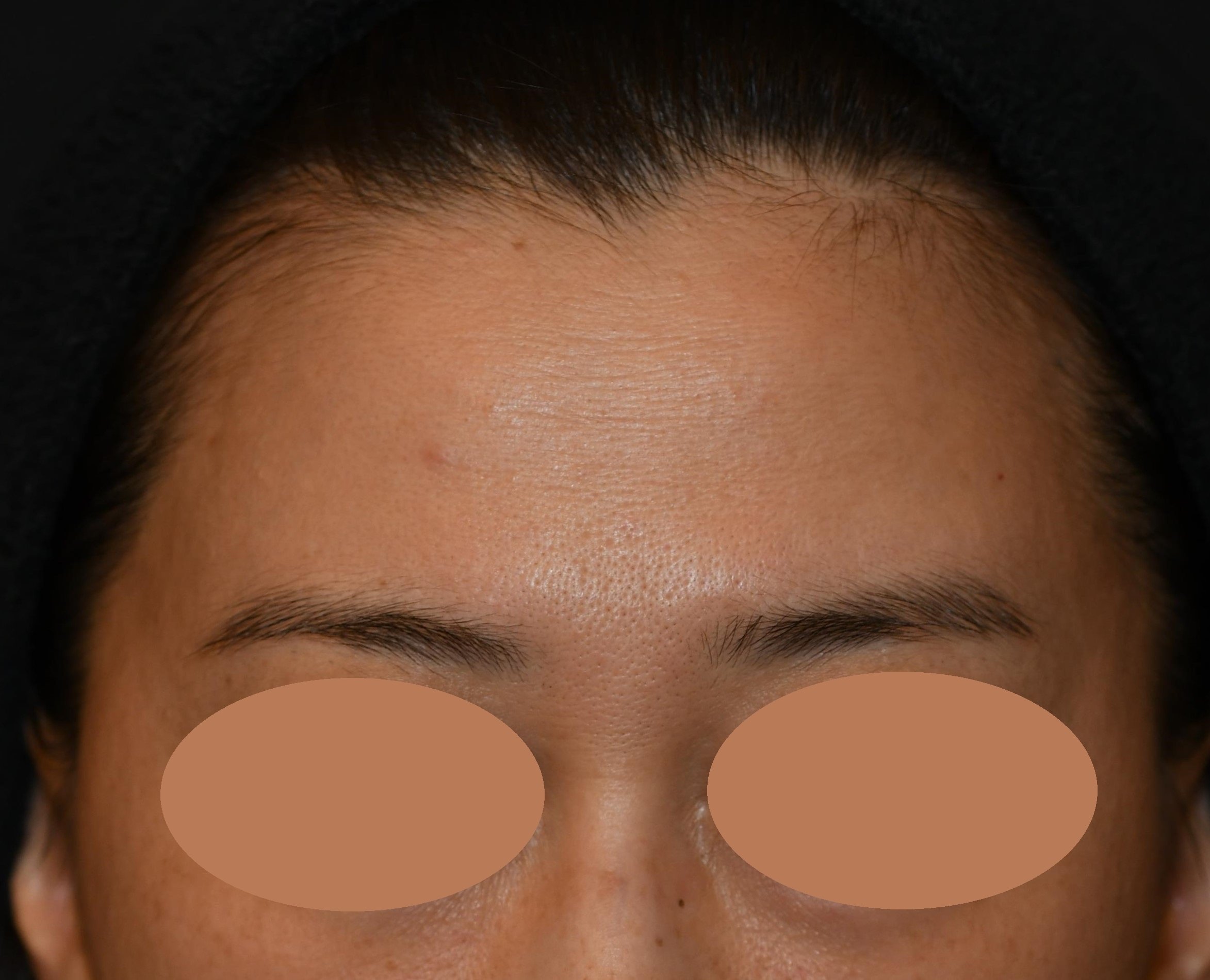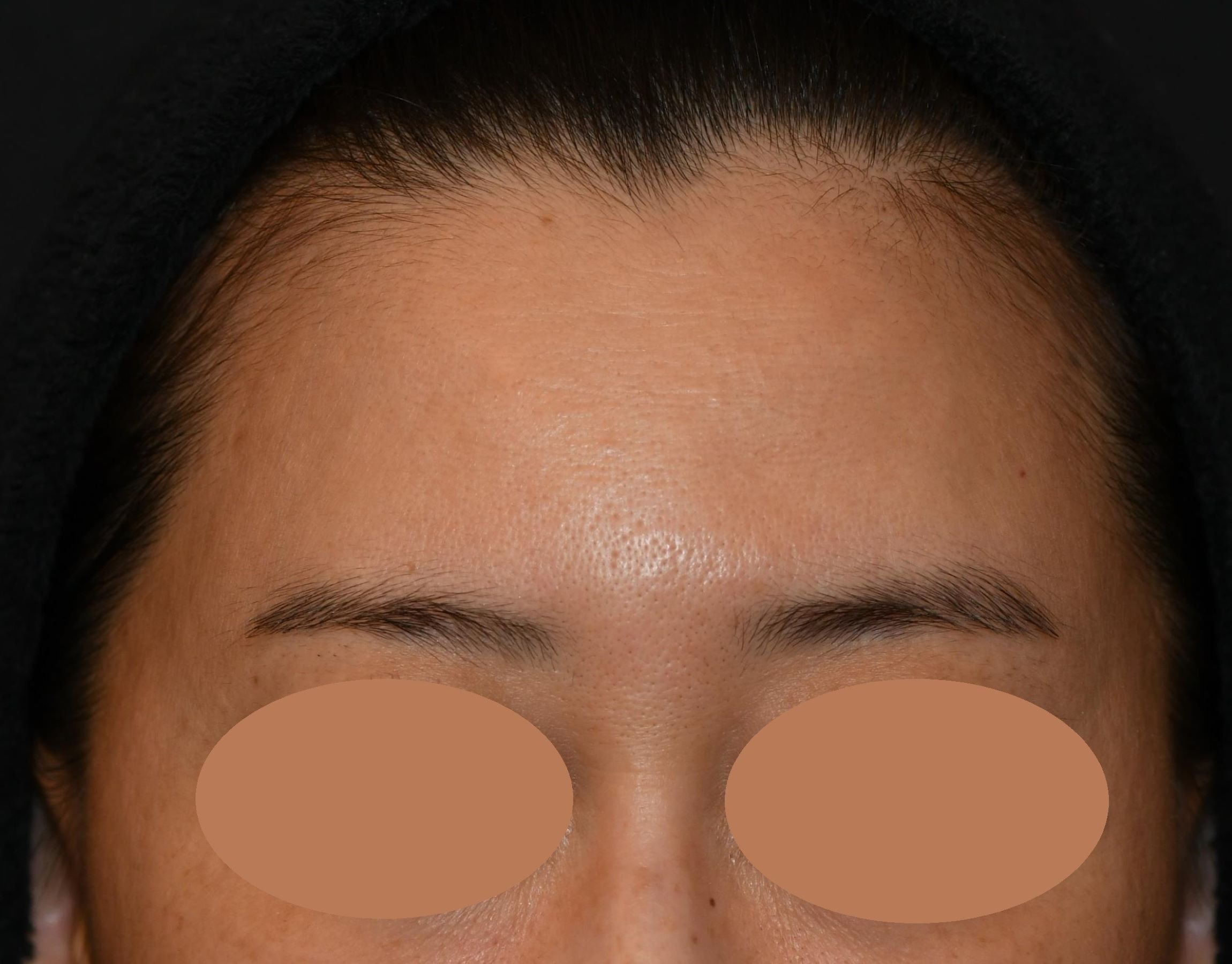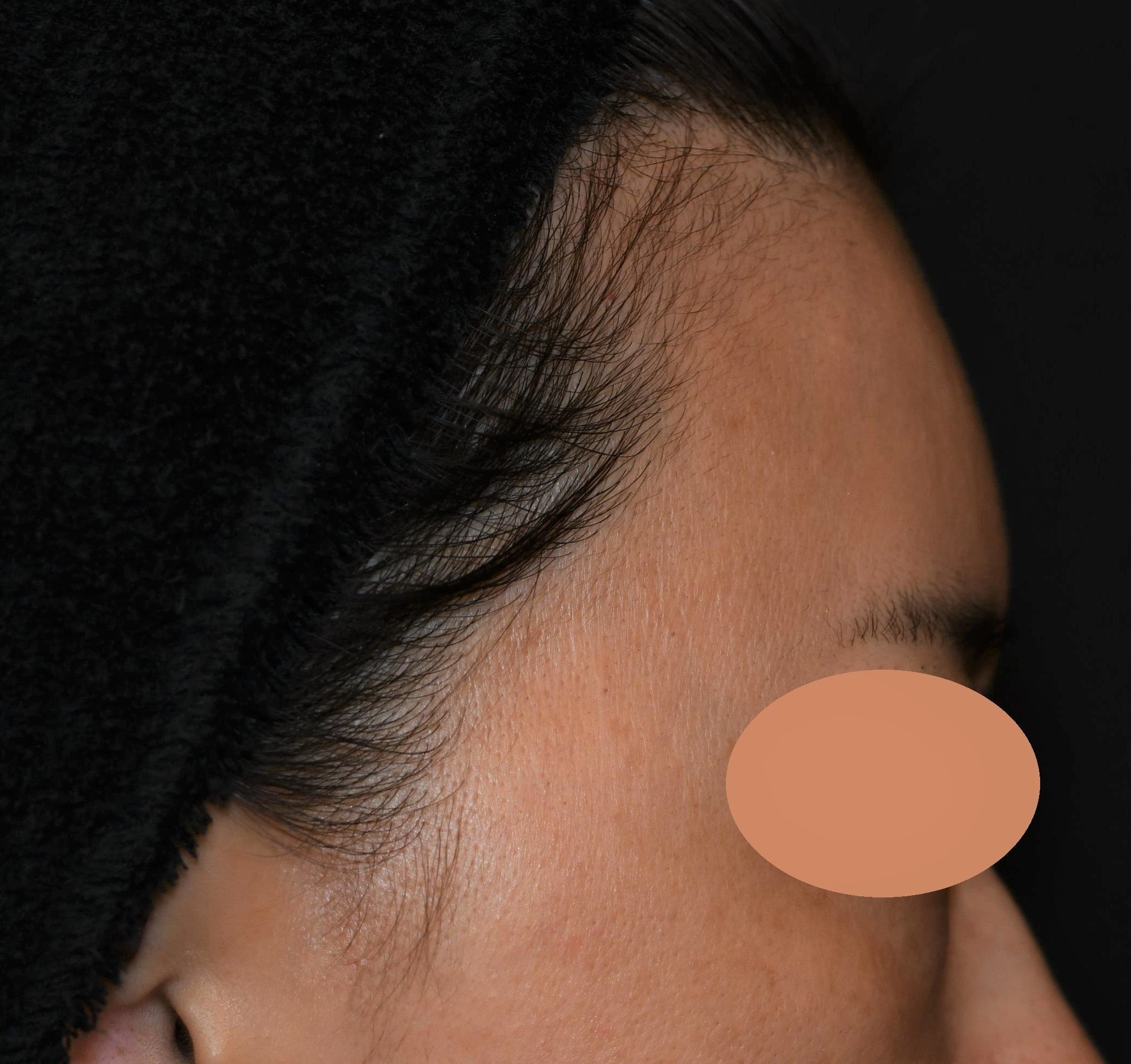 30代半ばごろから、額が痩せてゴツゴツした感じになり、シワが目立つようになったことがお悩みでした。額全体にに柔らかなレスチレンリドを2本、両こめかみにリフト力の高いレスチレンリフトリド0.6ml(残りは頬中央に注入)注入しました。額は凸凹などの失敗が多い部位ですが、ロングカニューレ針を用いて骨上に均一に注入することで理想的な額の丸みを作り出すことができます。ハリがでることで額の横ジワが寄りにくくなる効果や、目が開けやすくなるメリットもあります。左右のバランスを整え、あくまで自然に仕上げています。