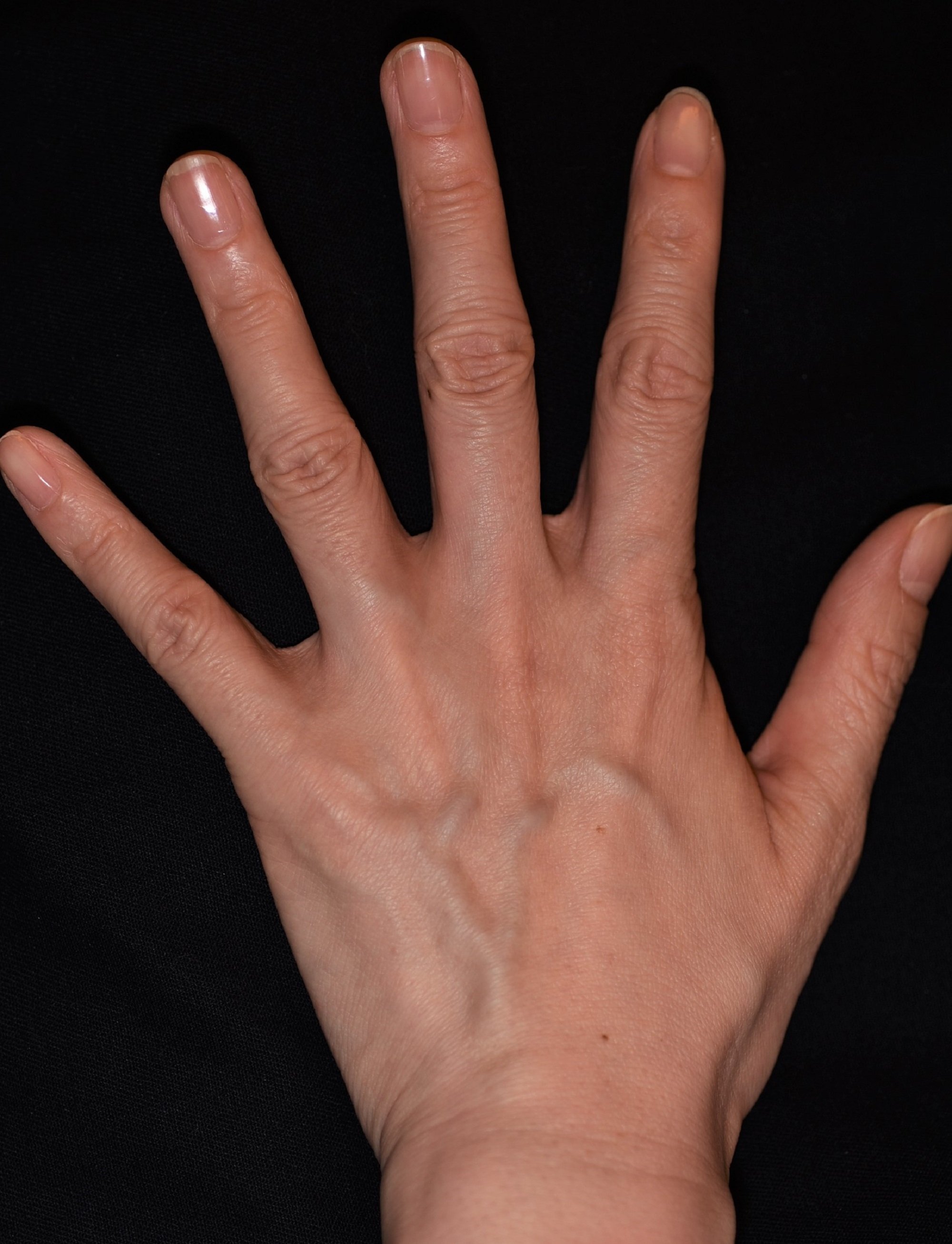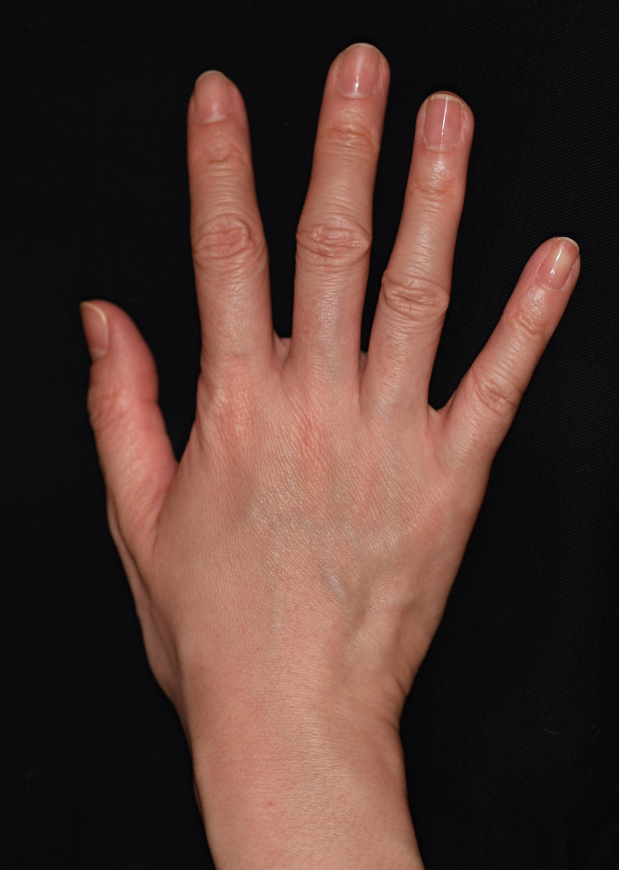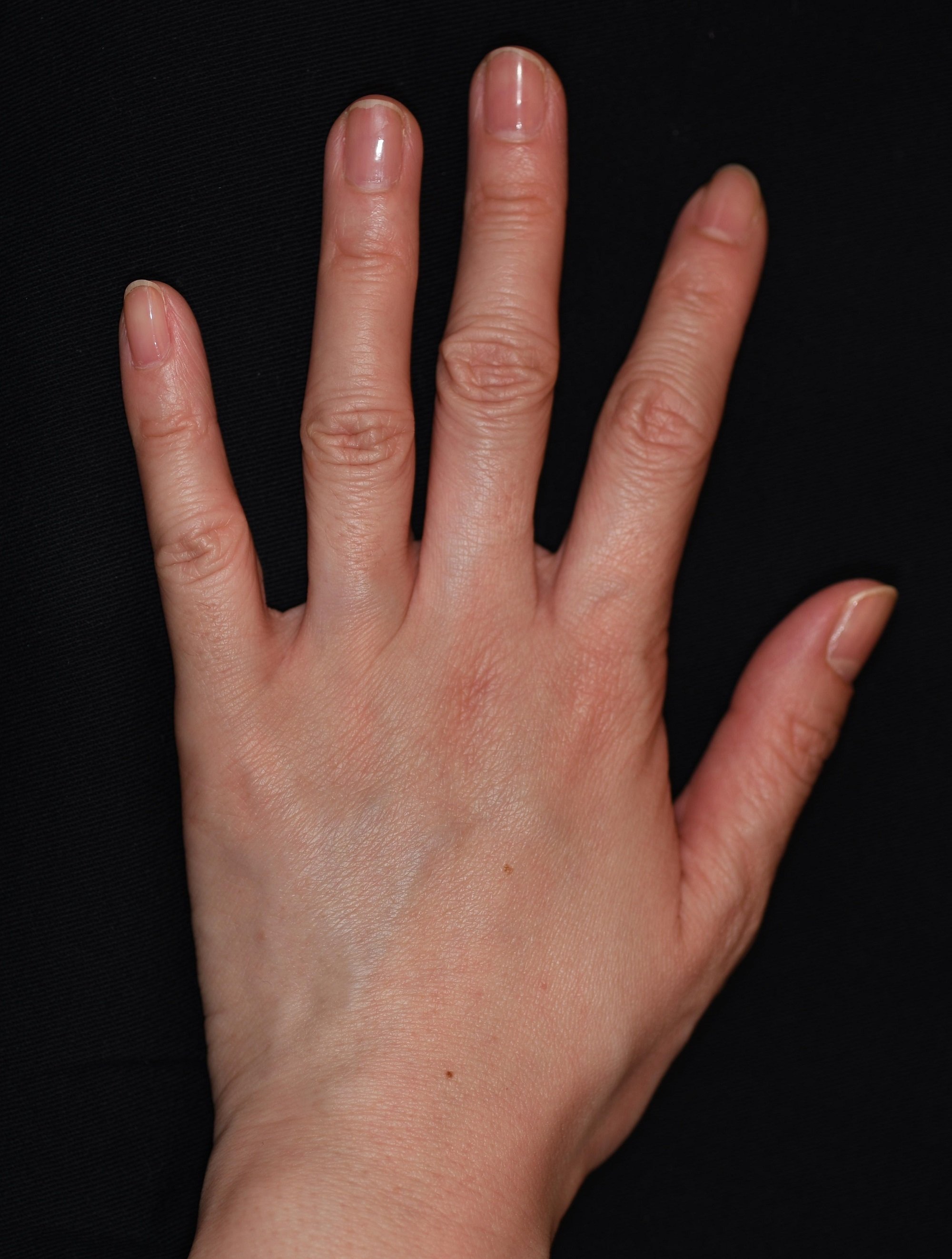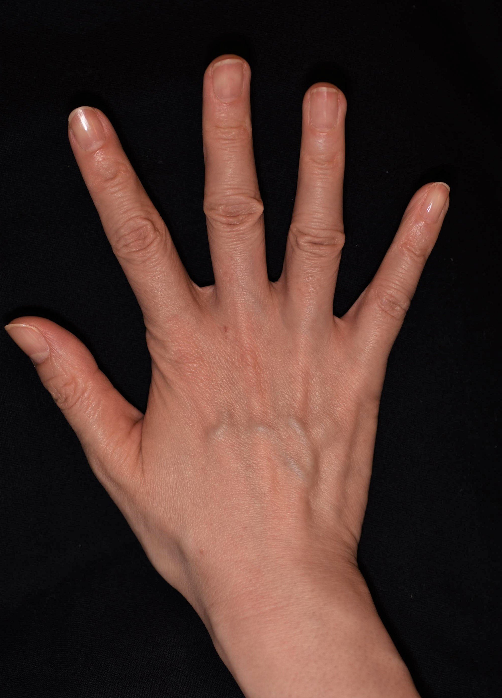加齢とともに手の甲の脂肪が少なくなり、筋張りや血管が太く浮き出て見えるのがお悩みだった方です。ヒアルロン酸を両手背に3本注入後は、ふっくらとして若々しい手になったとご満足いただきました。
