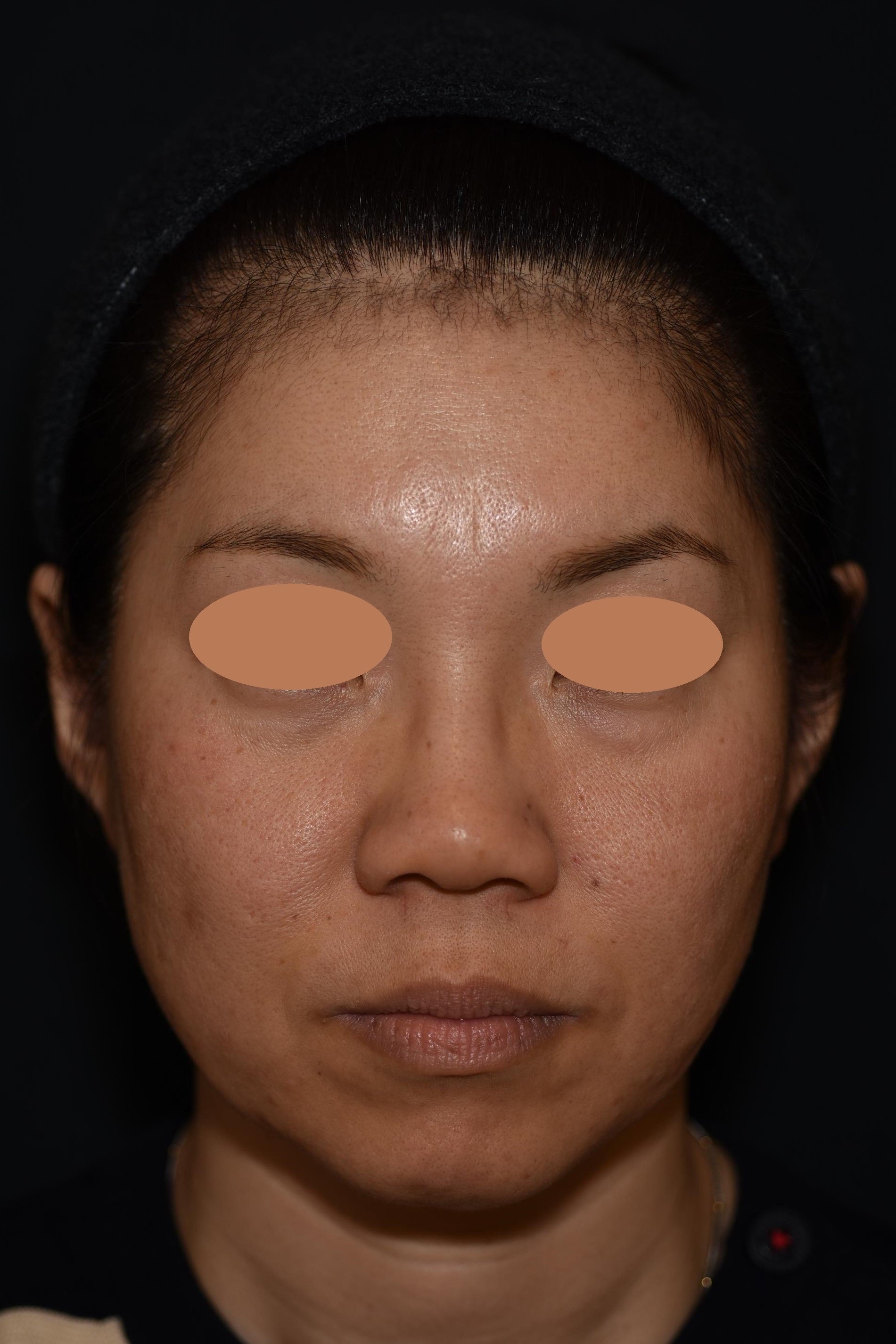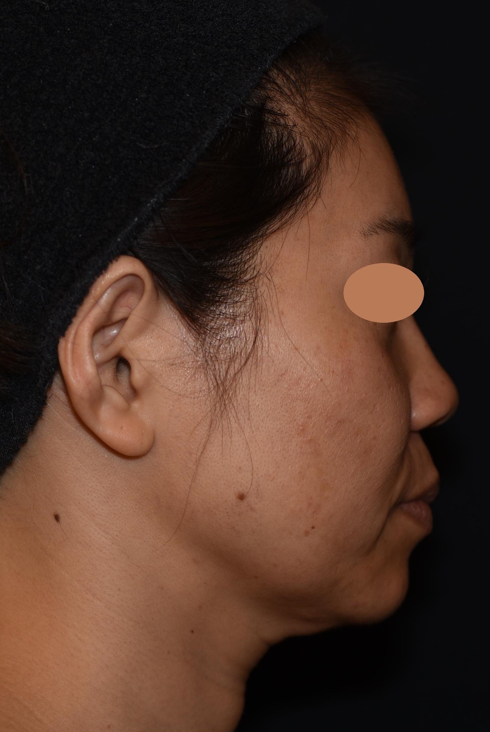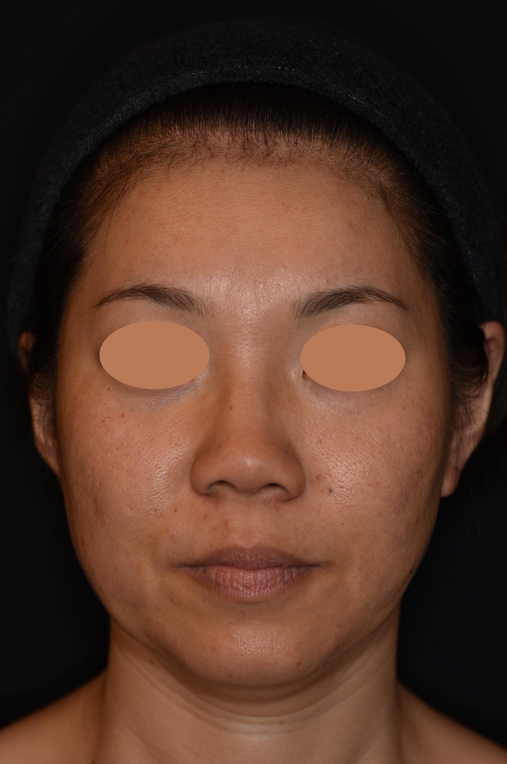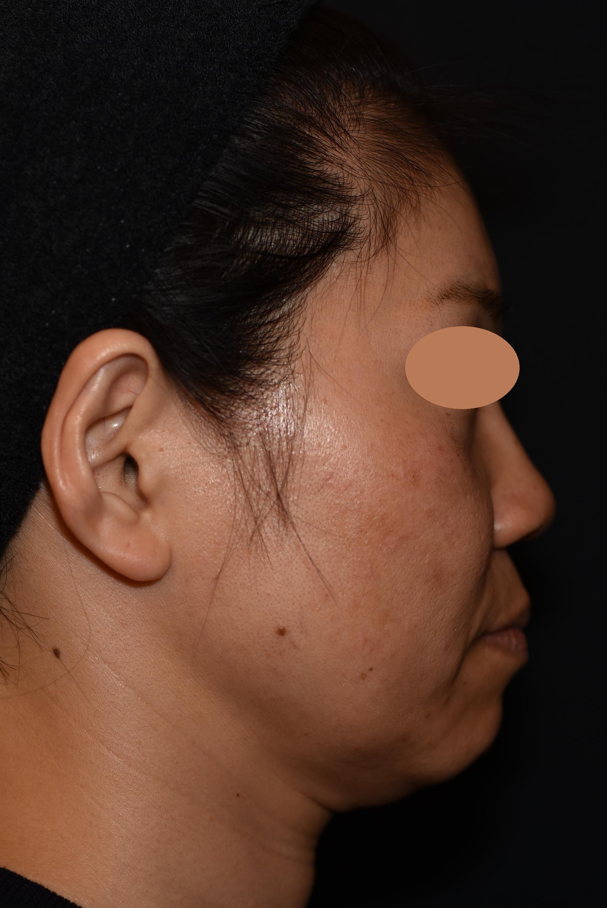 複数のお悩みを段階的に改善したいとのご希望でした。ご本人が数年「顔が大きくなった気がする」と感じていたのは、中〜下顔面のたるみによって、お顔の重心が下がってしまったことが原因です。このエリアにたるみが生じると、頬が平坦になりボリュームが下側に移動して、顔の形がスクエア型に変化していきます。また、顔の筋肉は年齢と共に拘縮(硬くなる)してきます。症例の女性もオトガイ筋(あごの筋肉)が拘縮して、収縮が強くなり顎先がやや内側に入り込んでいる状態でした。さらに、あご下脂肪のボリュームもある方なので、どこまでが顔でどこまでが首か分からなくなるので顔が大きく見えてしまうのです。 まずは、緩んだ皮膚を土台から強力に引き締めるウルセラからスタートし、その後スレッド治療によりさらに引き締め&引き上げ効果を高めました。その上で、細かいパーツを調整していきました。あご下は脂肪溶解注射でボリューム調整を行い、あごはボトックス注射で筋肉を滑らかな状態にしました。目の下は眼窩縁の凹みに馴染みのよいヒアルロン酸の注入を行っています。施術後の写真は初回から2ヶ月半後の写真です。頬の位置が高くなり、口周り・顎下のもたつき感が解消され、小顔効果が出ています。正面も横顔も非常にスッキリし若々しくなりました。自然な若返りで、周りにも気づかれにくく、ご満足頂きました。