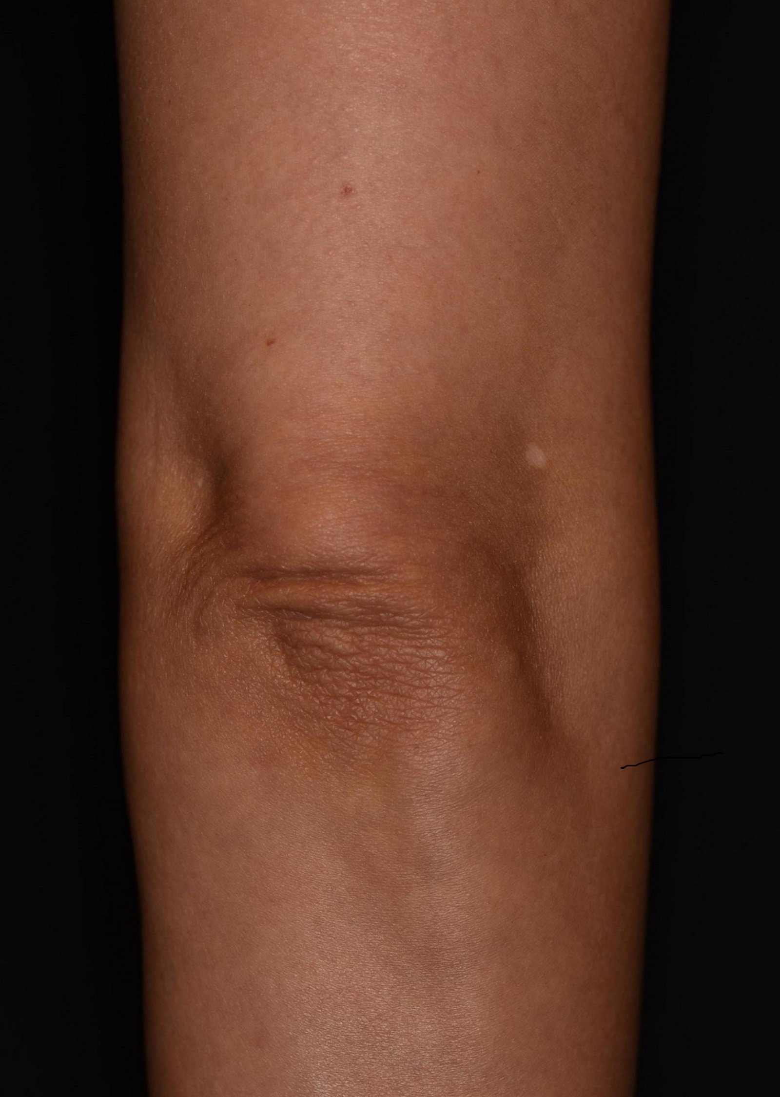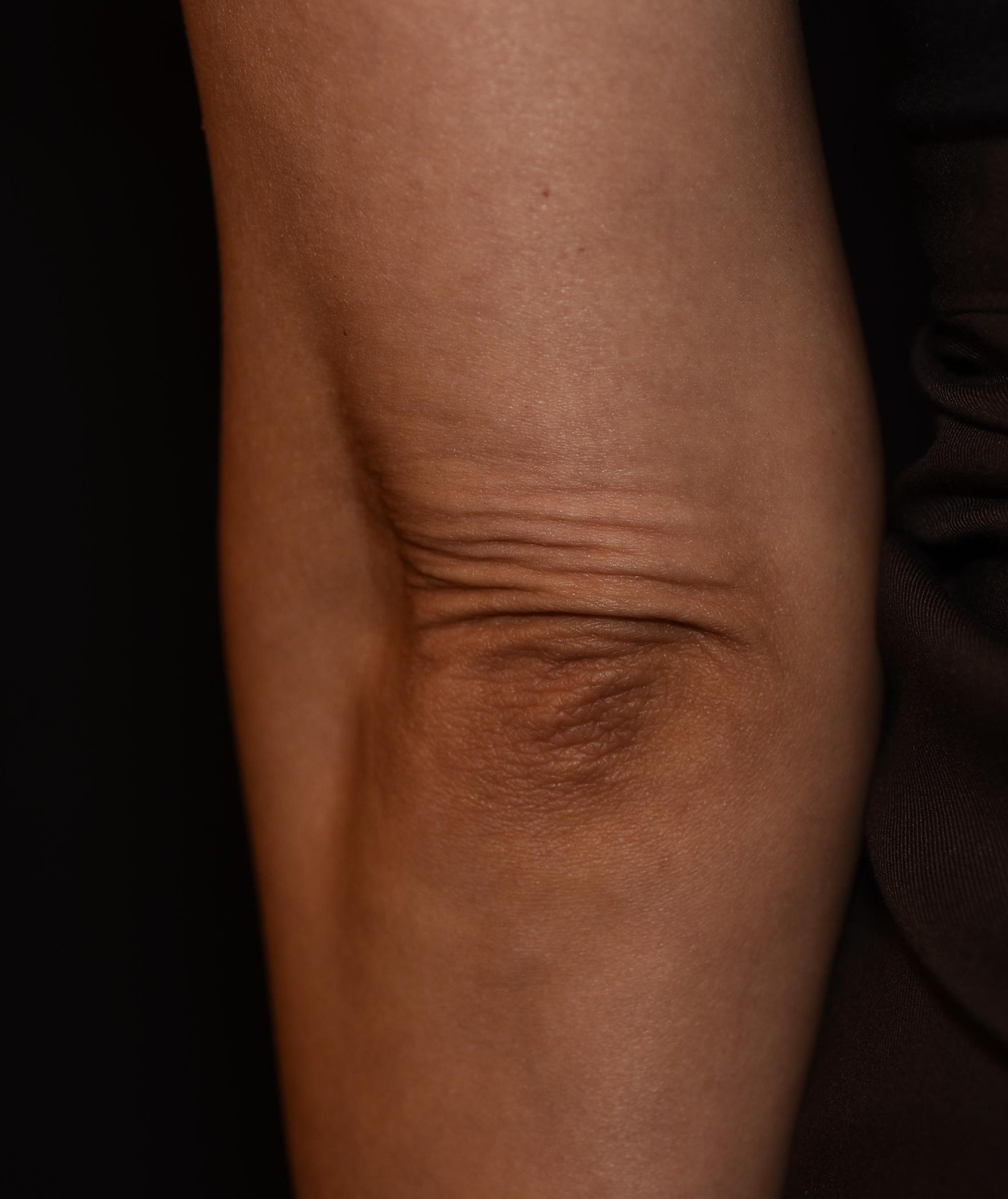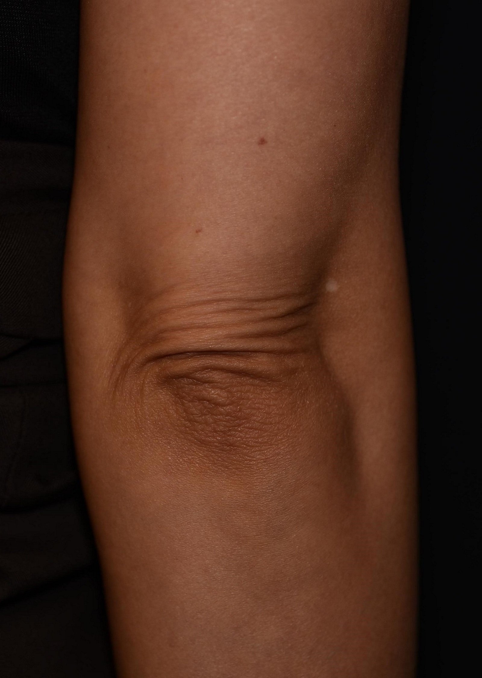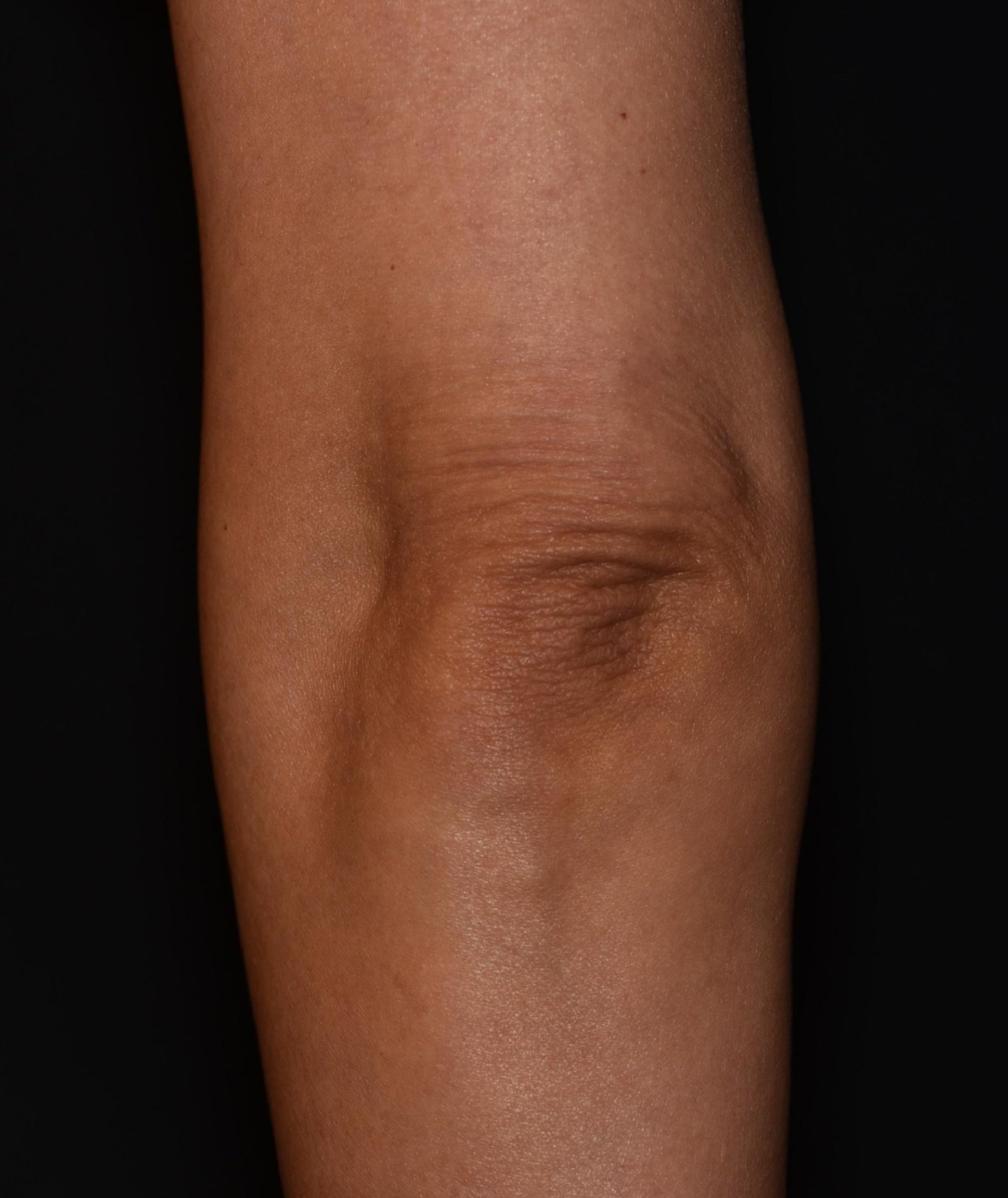 数年前からひじのたるみやシワが気になり始め、痩せたことでさらに目立つようになり来院されました。注入後は、ハリを失ってしぼんだひじがふっくらして、幾重にも重なったシワがかなり目立たなくなりました。 注入したヒアルロン酸は、徐々に代謝・分解されますが、ヒアルロン酸の周囲に自己のコラーゲン線維やヒアルロン酸などが新生するため、完全に元に戻ることはありません。減りきる前にタッチアップをしたり、繰り返し治療したりすると効果の持続期間は延長していきます。