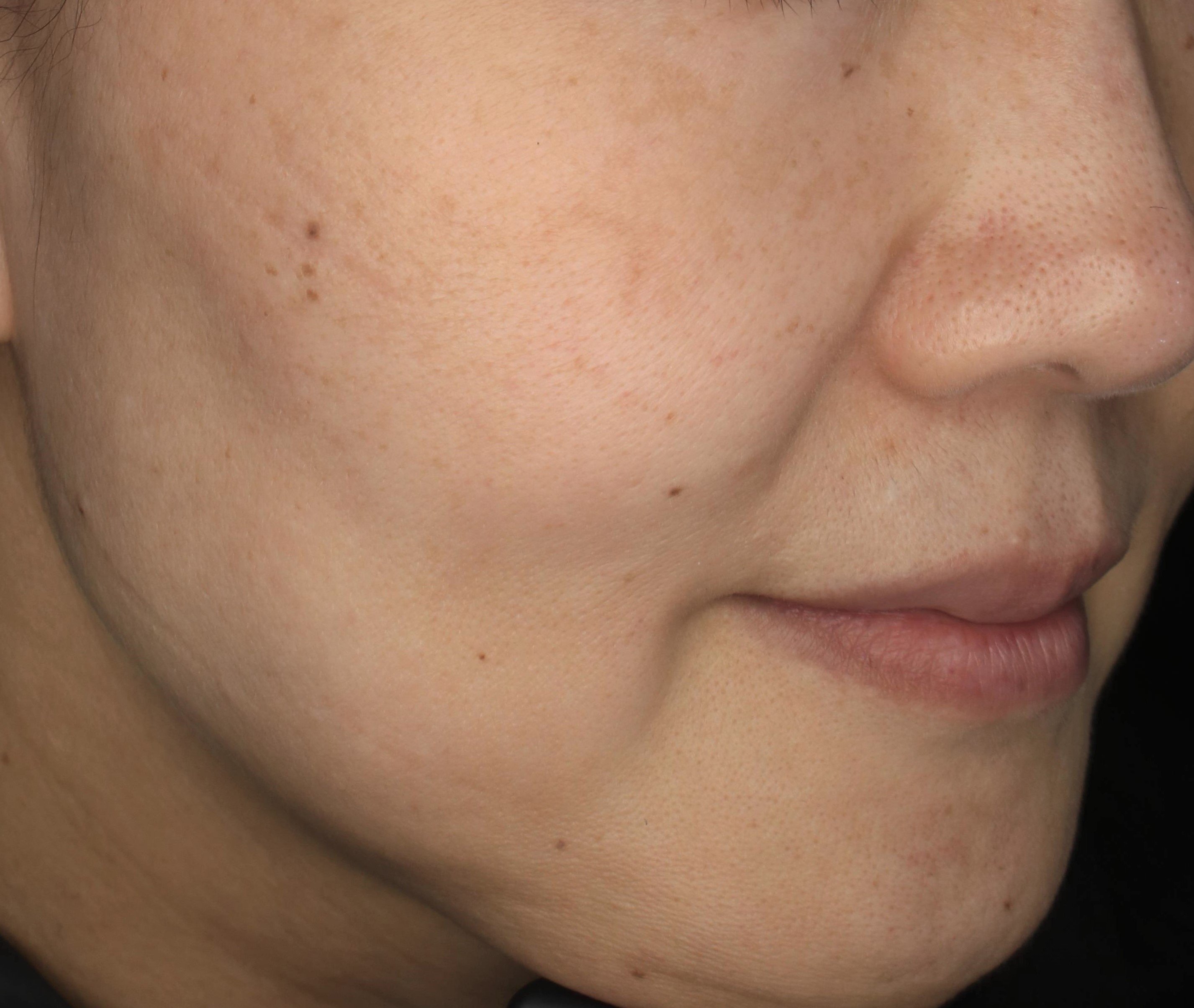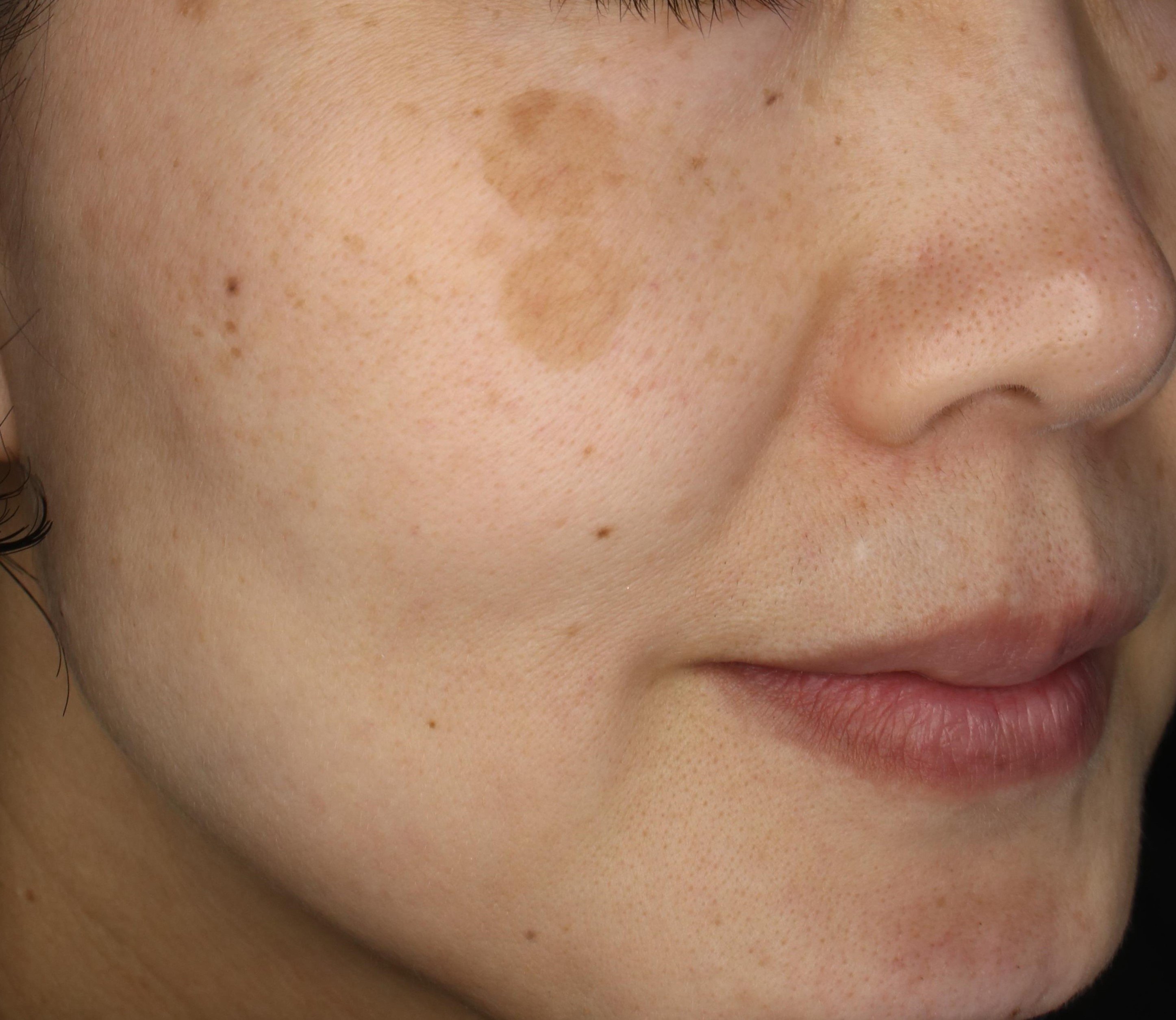 境界がはっきりした左右の大きなシミに対してはピコスポット照射を行いました。1回で綺麗に除去できましたが、施術後に軽い色素沈着が生じたため、ご自宅では美白内服の服用、ターンオーバー促進効果のあるナノメッドVAエッセンス(高濃度レチノール)と、メラニン合成を抑制するHQエッセンス(高浸透型ハイドロキノン)の外用剤を使用いただきながら、顔全体には1ヶ月毎にピコトーニング照射と抗炎症作用の高いトラネキサム酸のイオン導入を全8回行いました。 肌の深部に滞留しているメラニンを少しずつ分解・排出するピコトーニング照射は、何度も繰り返し施術を受けることで、徐々に色ムラを目立たなくさせ、肌全体の色調を明るくします。
