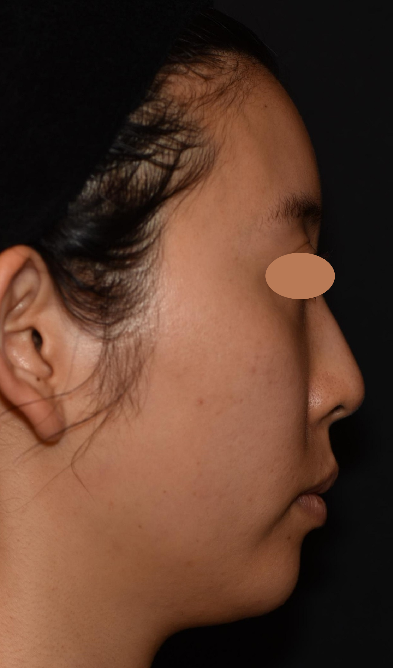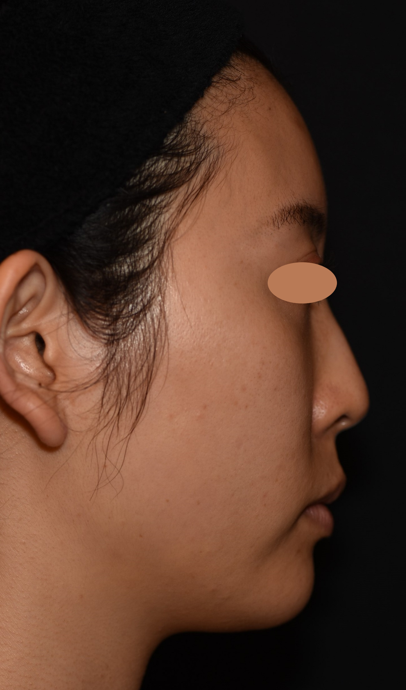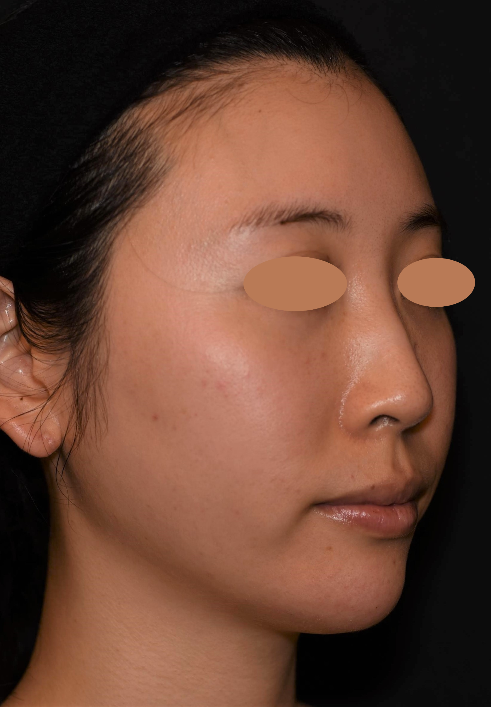 元々きれいな卵型のお顔立ちですが、あごがやや華奢な印象でした。そのため、顔と首の境目が曖昧になり、脂肪は多くないのに横から見ると二重あごに見えがちでした。通常の注入は、あごの正中線を挟んで左右2ポイントに同量で入れていきますが、症例の女性の場合、あごの頂点が左にずれていたのでど真ん中への注入で高さを出しつつ、右側だけに注入して左右均等感を高めています。さらにフェイスラインも左にハリがあったので、右側のフェイスラインの縁にも注入して左右の輪郭を整えています。 施術後は、鼻、あご、唇が一直線上に位置する「エステティックライン(Eライン)」が整って美しい横顔になりました。あごに高さが出てシャープになり、フェイスラインがよりスッキリ見えます。