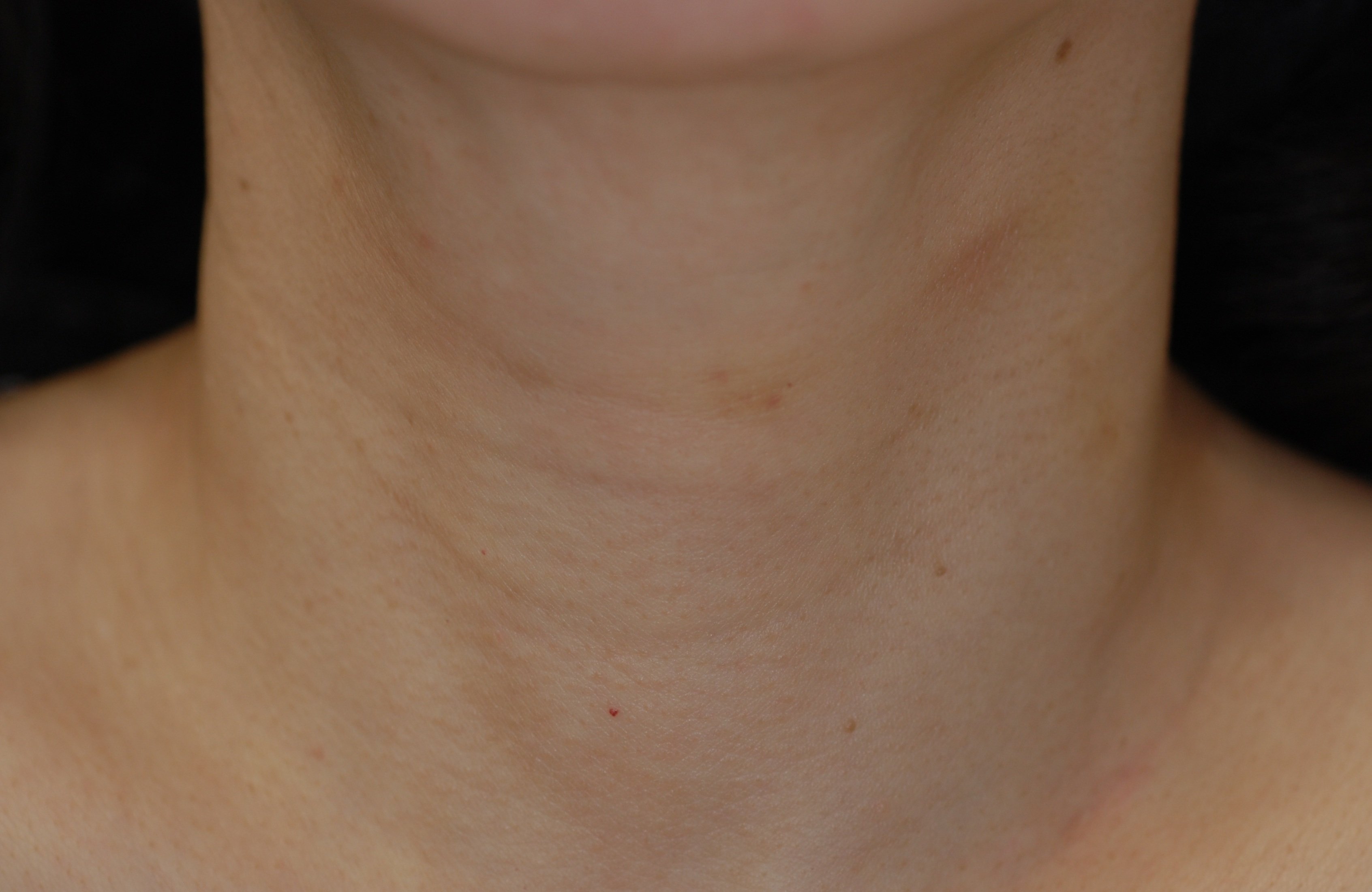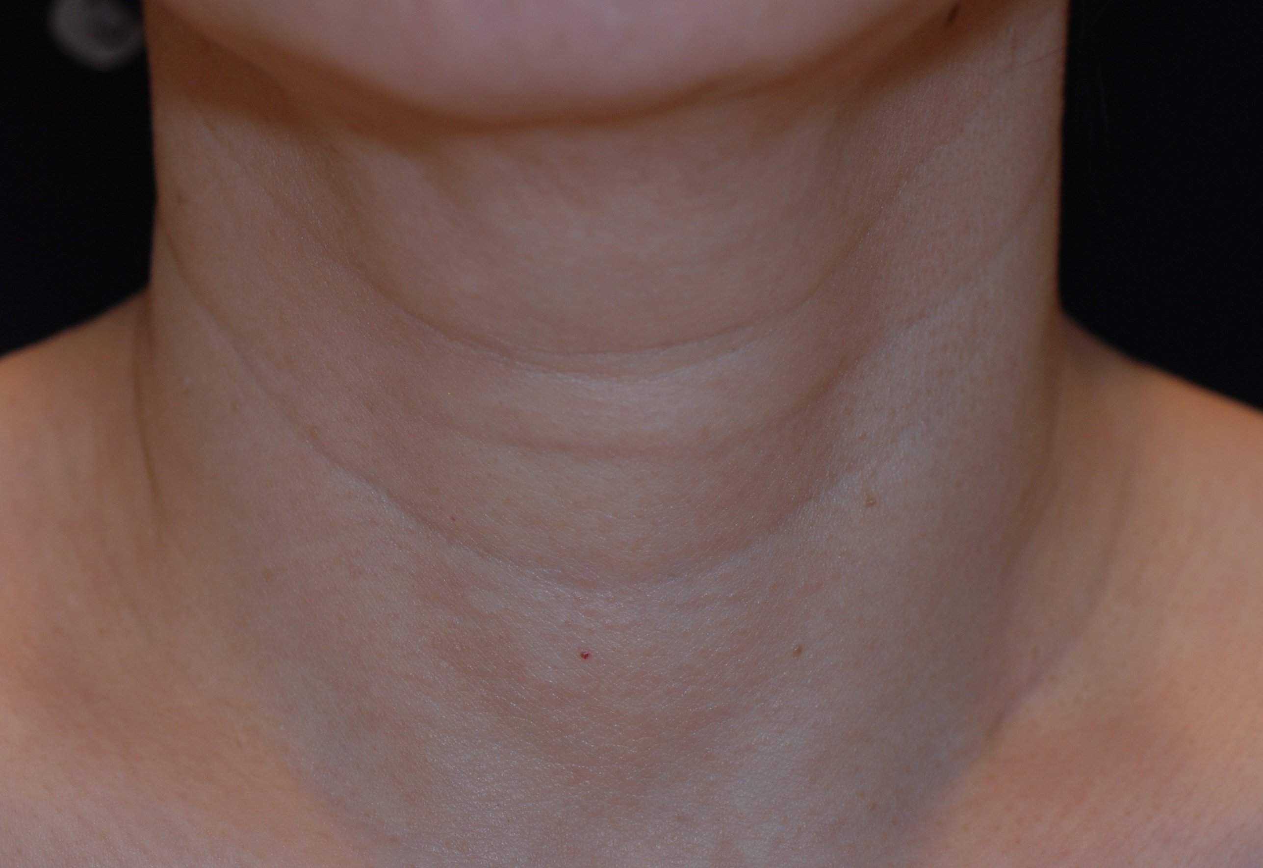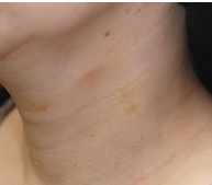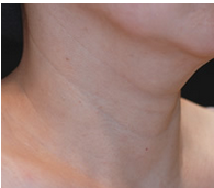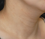 首は見た目年齢を左右する重要なパーツです。輪をかけたような首の横ジワにお悩みでした。注入したベロテロハイドロは、非架橋のヒアルロン酸製剤でありながら、ヒアルロン酸密度が高く折りジワを少しずつ浅くする効果があります。また、保湿効果に優れハリのある肌質に変えていきます。 2回の注入で、横ジワはかなり目立たなくなり首にハリが出ました。何回か定期的なメンテナンスを継続するうちに、注入したヒアルロン酸の周囲に自己のコラーゲン線維の増生が貯金効果を生むので、効果の持続時間は長くなっていきます。