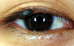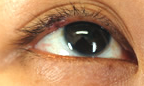 右眼瞼縁に小児期から存在する横幅が11㎜ある大きな深いほくろがありました。切除縫合術を勧められることの多い、直径6~15mmの大きなほくろは、2~5分割して1回ごとの手術の傷を小さくして段階的に除去します。まぶたやまつ毛の間に出来たほくろも、手術用コンタクトシェルで眼球を保護して施術が可能です。 1回目は瞼の変形とまつ毛の保護の観点から、あえて少しだけ色素を取り残し、上皮化させています。2週間後の追加照射で、ほぼきれいに取り除くことができて、非常に喜んでいただきました。