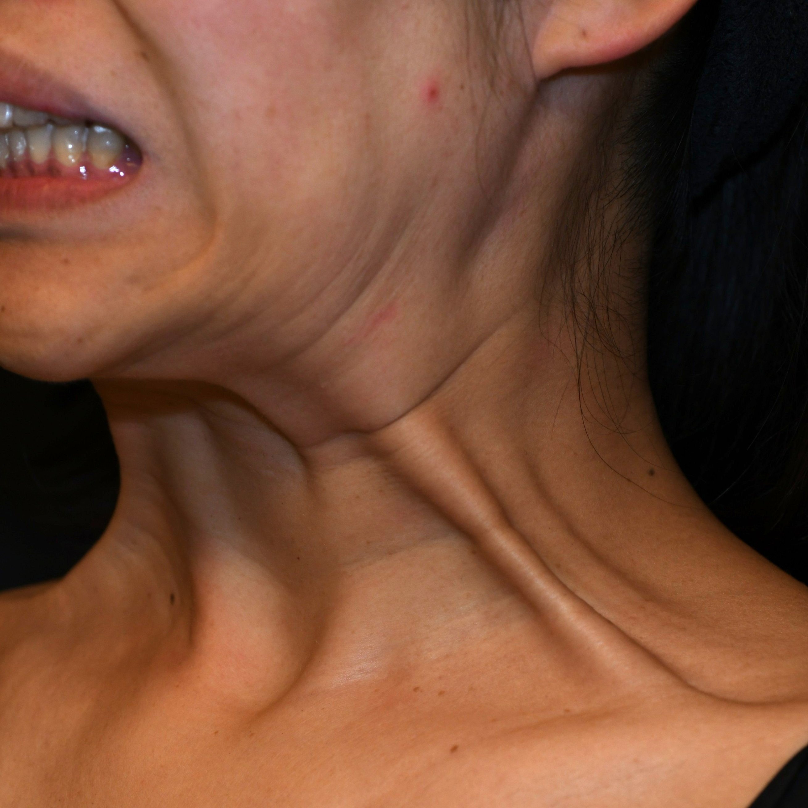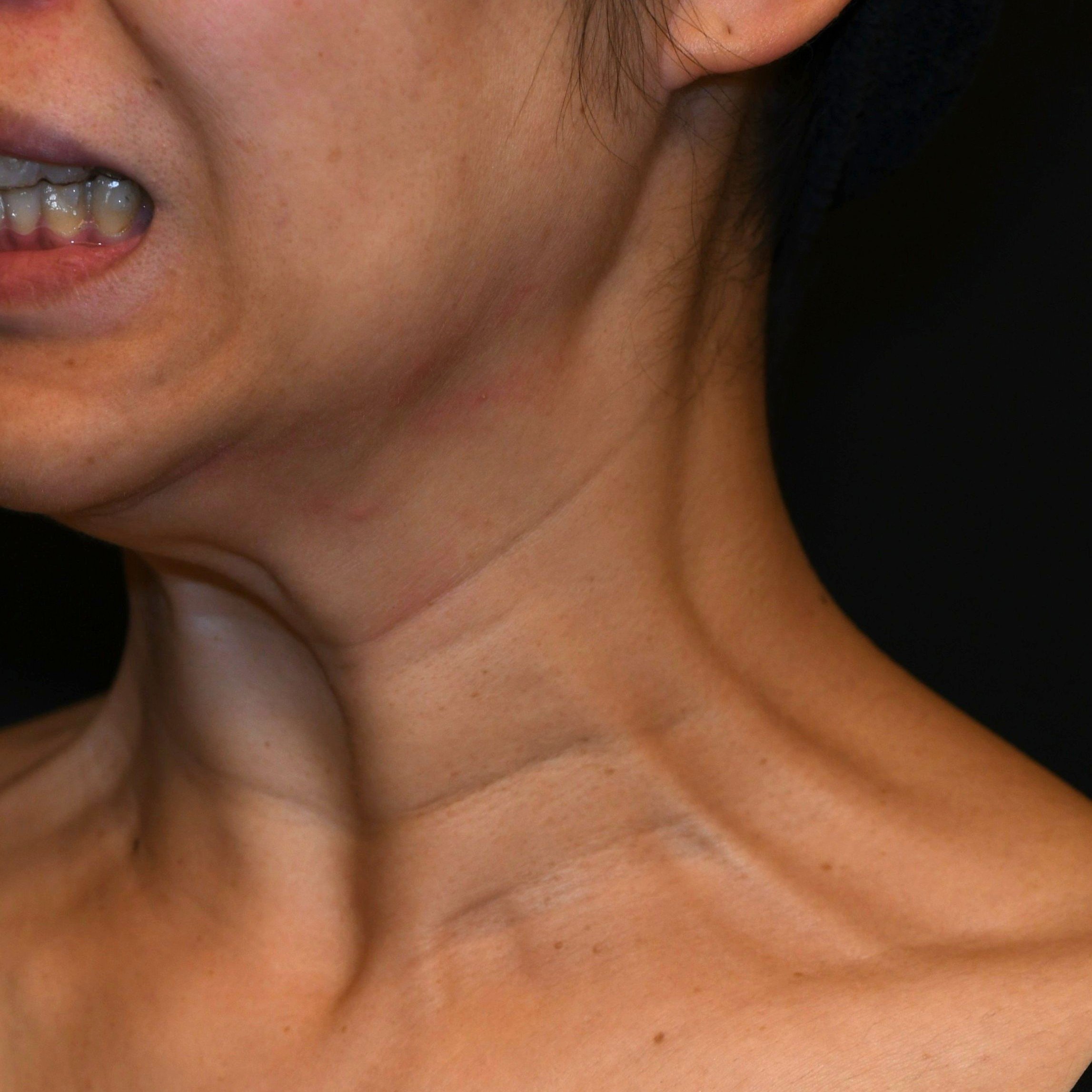 思いっきり笑うと現れるのは、目尻のシワや鼻のバニーラインだけだと思っている方が多いのではないでしょうか?実は、広頚筋という首に薄く膜状に広がる筋肉は、加齢とともに強さを増し、イーっと発声する、力を入れる、大笑いする時などに縦筋として現れます。これは七面鳥の首に似ていることから「ターキーネック」と呼ばれ、老化症状の一つです。60代以上のほとんどに見られますが、30代から加齢とともに少しずつ強くなります。広頚筋はフェイスラインを下方向に引っ張り下げる作用があるため、輪郭の崩れを加速させ、たるみを目立たせてしまいます。こちらの女性はかなり広頚筋バンドが強く出ており、ボトックスリフトの適応が高いタイプです。広頚筋バンドは筋肉内に、フェイスラインと首全体には皮内に浅くマイクロボトックスのテクニックで注射しました(ネフェルティティリフト)。同時に、梅干ジワの原因オトガイ筋にも行いました。イーっと食いしばっても、大笑いしてもバンドが出なくなり、真顔の状態でも驚くほどフェイスラインがスッキリしたと大変ご満足いただきました。ここまでバンドが強く出ない方も、横顔の理想形「ネフェルティティ女王」のような美しい輪郭を作るためにはおすすめの治療です。ボトックス注射だけでここまでリフトアップさせることが出来るのも、お一人ひとりの最適な注射法で行うからこそ。安心してお任せください。