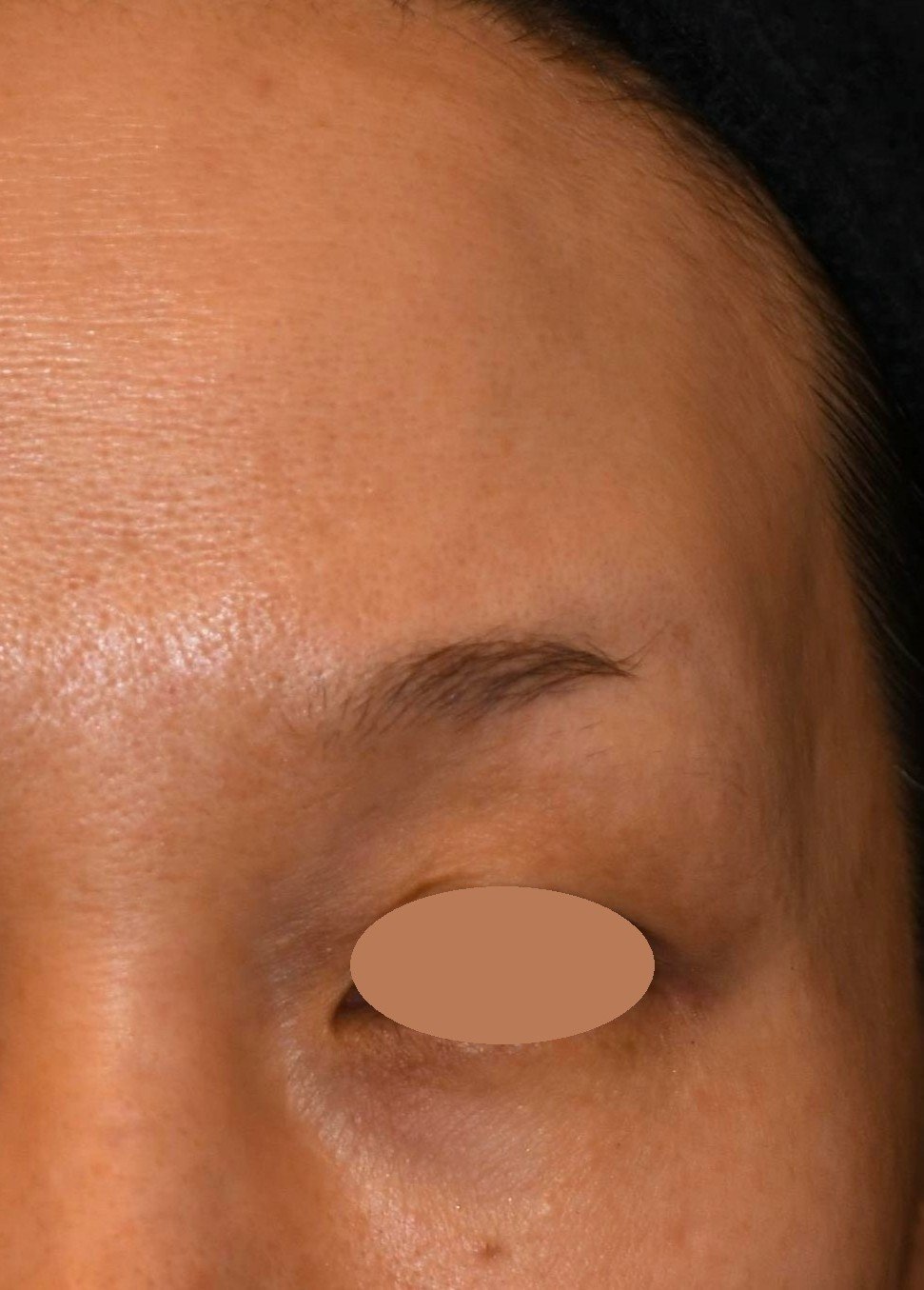 自然な老化で額が痩せてくると、眉上~こめかみが凹んできます。この女性は逆で、両眉上に不自然な膨らみがあり、眉を動かしにくいというお悩みで受診されました。眉を頑張って挙上させているので怒ったように見えています。約3年前に他院で注入したヒアルロン酸製材の悪影響と判断し、溶解注射を行いました。眉上に三角形に隆起したエリアが平らになり、なだらかな形に戻りました。また、眉も動かしやすくなり、不自然な眉の挙上が治まり、自然になったと周囲の評判も上々だそうです。当院では額の骨膜上に面状にヒアルロン酸を注入します。形が若々しく美しく整うだけでなく、前頭筋がストレッチされ額の横ジワが寄りにくくなります。また、目の開きも改善されるので大人気の治療です。今回の事例は注入層が浅すぎ、凸凹と眉の挙げづらさが生じてしまったと推測できます。製材を溶解するだけで改善しましたが、溶解までの期間が1年を超えると、しこりが残る場合があるので、早めにご相談ください。