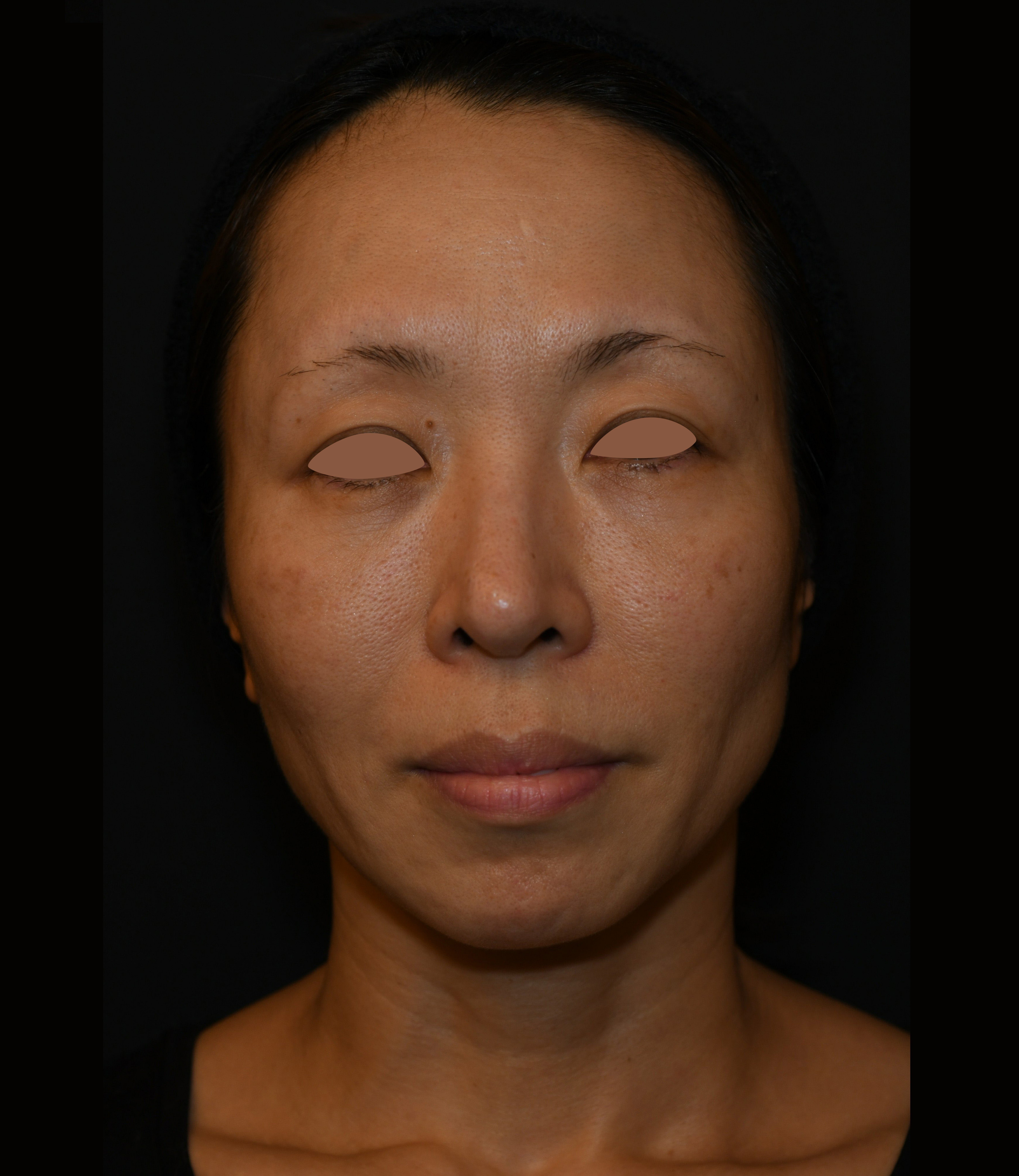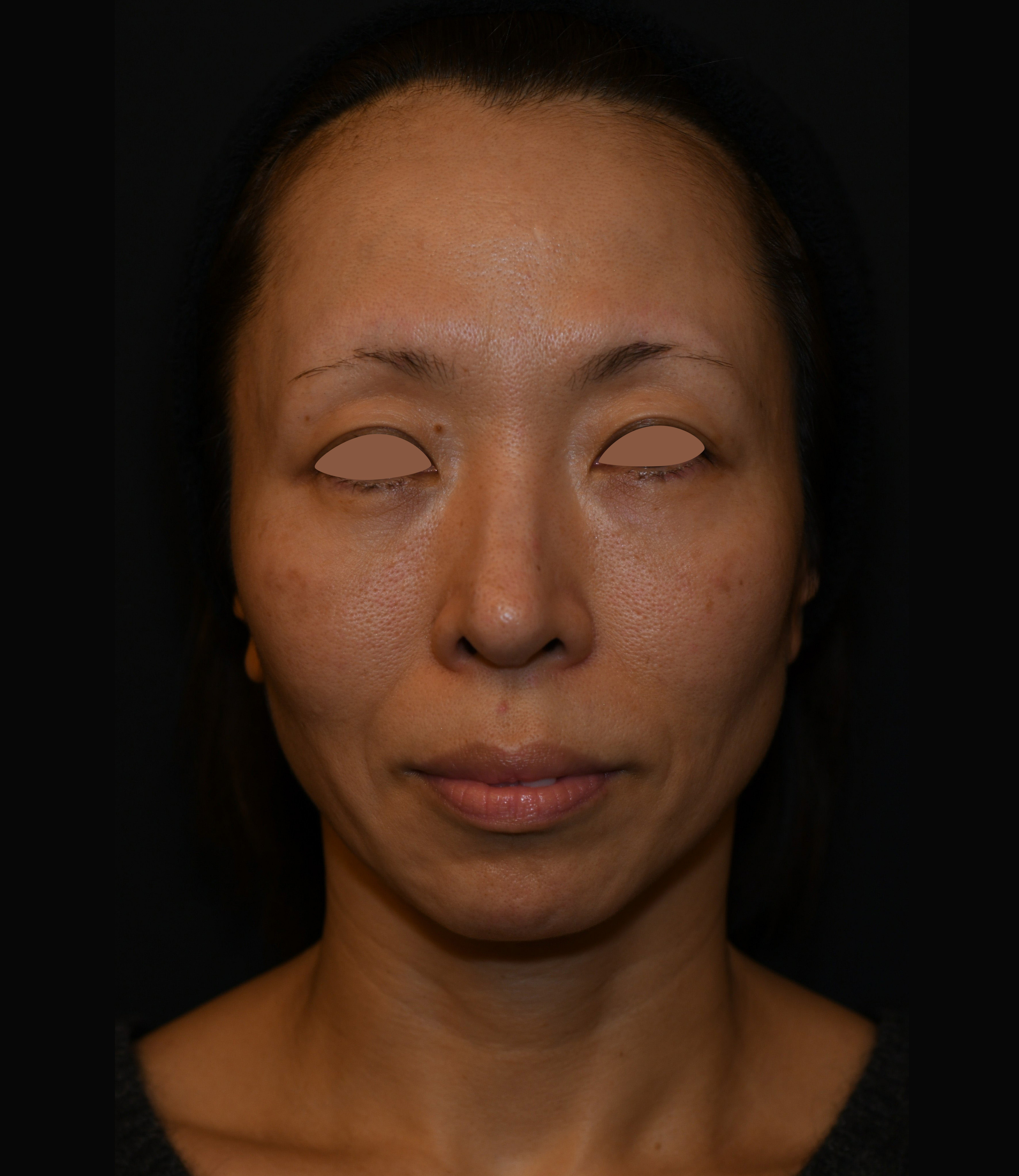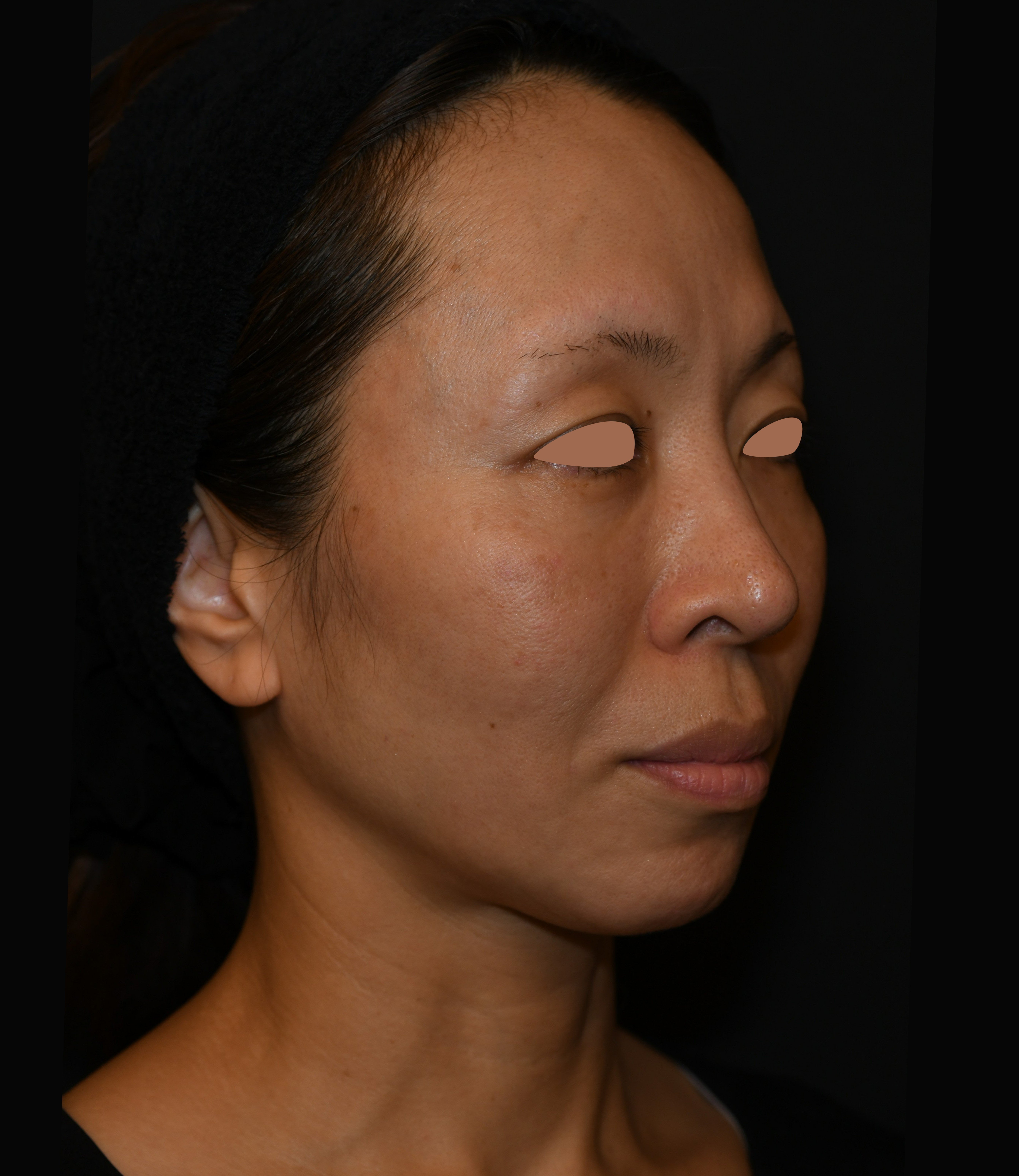 頬コケやコメカミの凹み、口周りのシワで疲れて見えることがお悩みでした。レスチレンディファインとリファインを口周りに2.4ml、頬外側・コメカミ・目の下に1.6ml、広範囲に薄く面状に注入したところ、輪郭のコケと口元のシワが改善されました。また、目の下のクマが浅くなり、頬位置が上がり、リフトアップ効果も得られ、大変ご満足いただきました。脂肪浅層にロングカニューレ針(鈍針)で無数の傷をつけるサブシジョンテクニックで、皮膚を支える薄いヒアルロン酸の層を作ります。削げのある部分のみに繊細に注入することで、顔を大きくせず、自然な若返り効果をもたらします。ヒアルロン酸製材はコラーゲンを再生させるため、1年以上かけて皮膚のハリが高まるためヒアルロン酸が無くなってもコラーゲン貯金は残ります。自然な若返りと美人顔バランスに整えるヒアルロン酸注入の鍵は、解剖学の知識と製剤特性の理解、高い技術の3つ。不自然なヒアル顔が心配な方はぜひご相談下さい。
