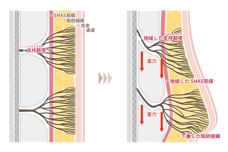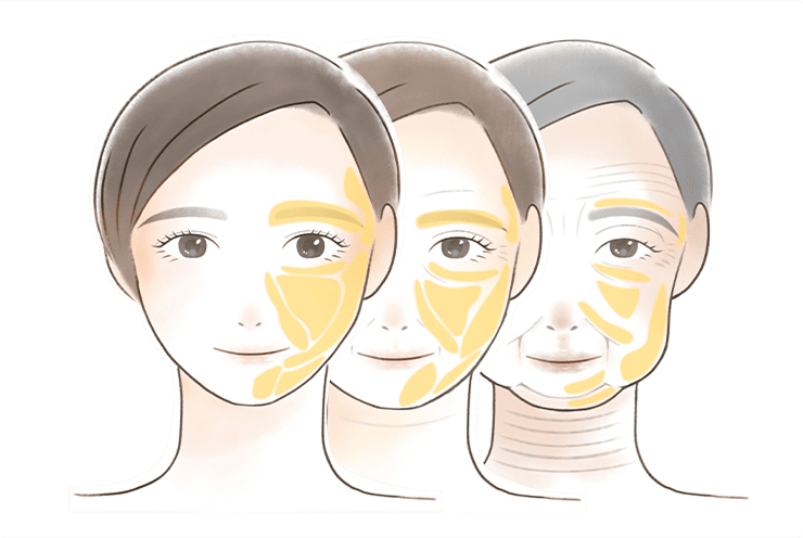 たるみ治療で確かな効果を得るためには、まず「なぜたるみが起こるのか」という老化の本質を理解することが重要です。顔の老化は皮膚だけの問題ではなく、その下にある脂肪、筋肉、靭帯、骨といった多層構造の変化によって生じます。これらの組織が年齢とともに萎縮や下垂を起こし、顔の立体構造そのものが少しずつ変化していきます。とくに40代以降は、各層の変化が重なり合うことで、たるみはより顕著に現れるようになります。