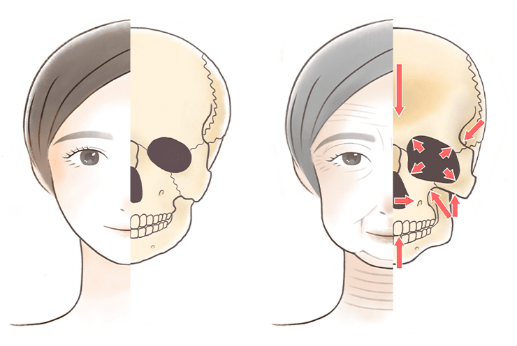 もともと皮下脂肪が少なく、輪郭や骨格の美しさが際立つタイプです。若い頃は、適度な脂肪がクッションとなり、やわらかく優しげな印象を保っています。しかし加齢とともに皮下脂肪は確実に減少し、骨格の陰影が強調されやすくなります。脂肪が減ることで皮膚に余りが生じ、シワっぽさやハリの低下が目立ち始めます。頬やこめかみのふっくら感が失われ、顔全体が削げた印象へと変化します。さらに、眼窩周囲の骨も萎縮するため、目のくぼみや上まぶたの落ち込みが強調され、疲れた印象や実年齢以上の老け感につながります。このタイプでは「重みで下がる」のではなく、「支えが失われてやつれる」ことが主な問題です。脂肪の多いタイプとはアプローチが大きく異なります。
