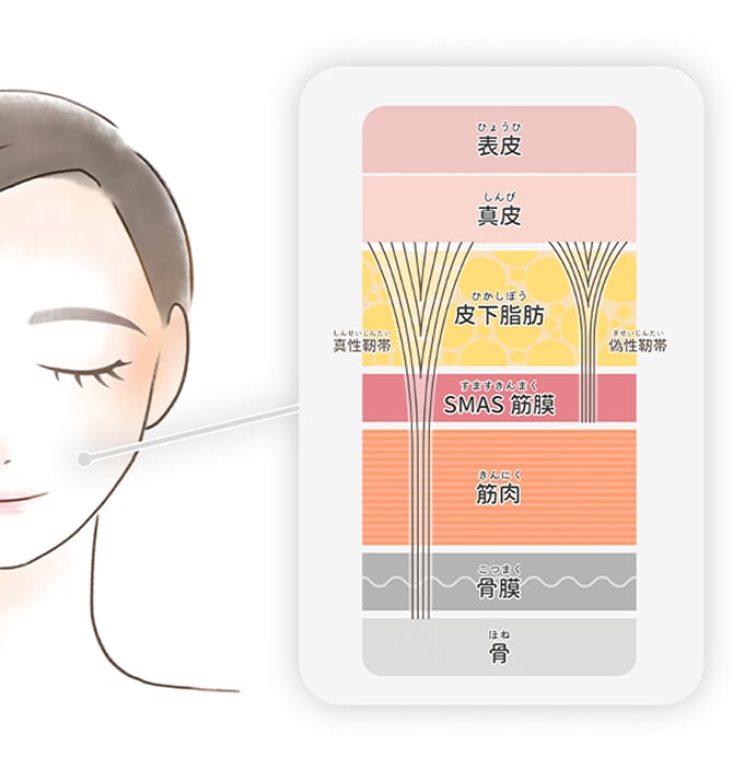 脂肪を減らすことが目的ではなく、SMASや皮膚のタイトニングを穏やかに行い、輪郭を引き締めることが目的です。強い脂肪収縮を伴う治療は避け、あくまで"ゆるみの補正"にフォーカスします。