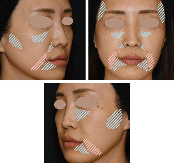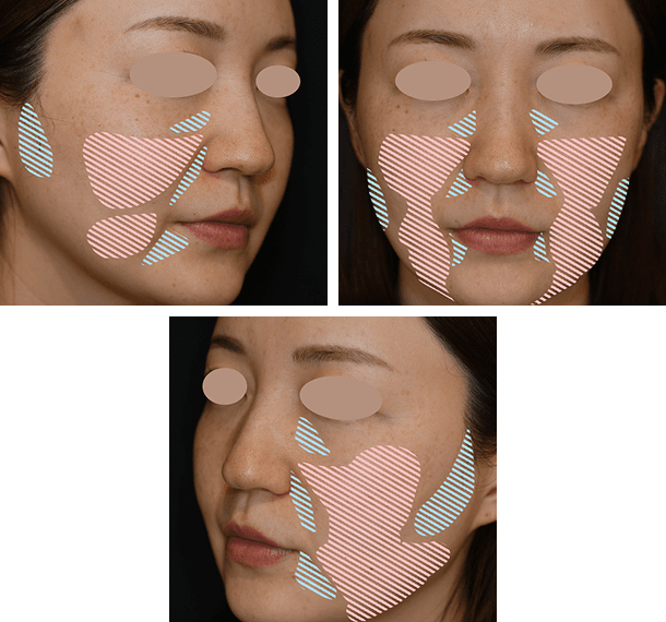 まず、中顔面のリフトポイントへ架橋ヒアルロン酸を注入し、靭帯付着部を補強して下垂した組織を内側から引き上げます。そのうえで、目の下や頬外側など萎縮している部位へ自然なボリュームを補います。これにより、余分な重みを軽減しつつ、失われた高さを再構築し、顔全体の重心を上方へ戻します。