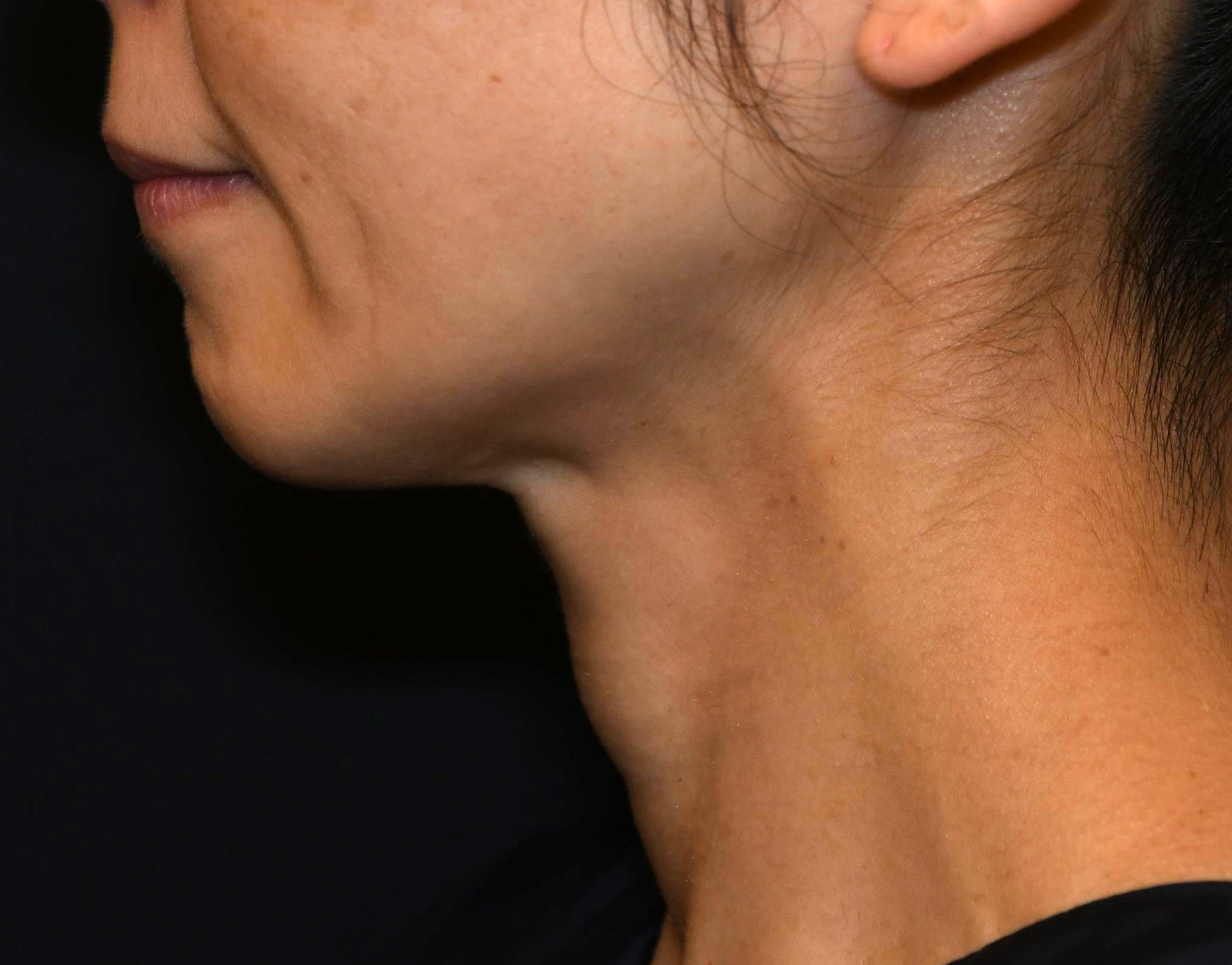 あごの形は加齢によって変化します。一つは骨や脂肪が萎縮するボリュームロスによるもので、もう一つはオトガイ筋というあごを上方向に縮める筋肉が強くなり梅干ジワが目立つことによるものです。皮膚がゆるみ、脂肪が柔らかくなると、表情筋の動きが強くなります。フェイスラインから鎖骨に広がる、広頚筋という膜状の筋肉が広がっており、力を入れたり食いしばったりすると輪郭を下に引き下げます。この筋肉が強くなる40歳ごろから、広頚筋バンドと呼ばれる縦筋が見え始めると、七面鳥のように見えるため「ターキーネック」と呼ばれます。広頚筋は頬を下に引っ張るので、輪郭の崩れにつながります。オトガイ筋と広頚筋にボトックスを注射すると、あごの形が整い、輪郭が引き上がるので横顔が美しく整い、大変ご満足いただきました。
