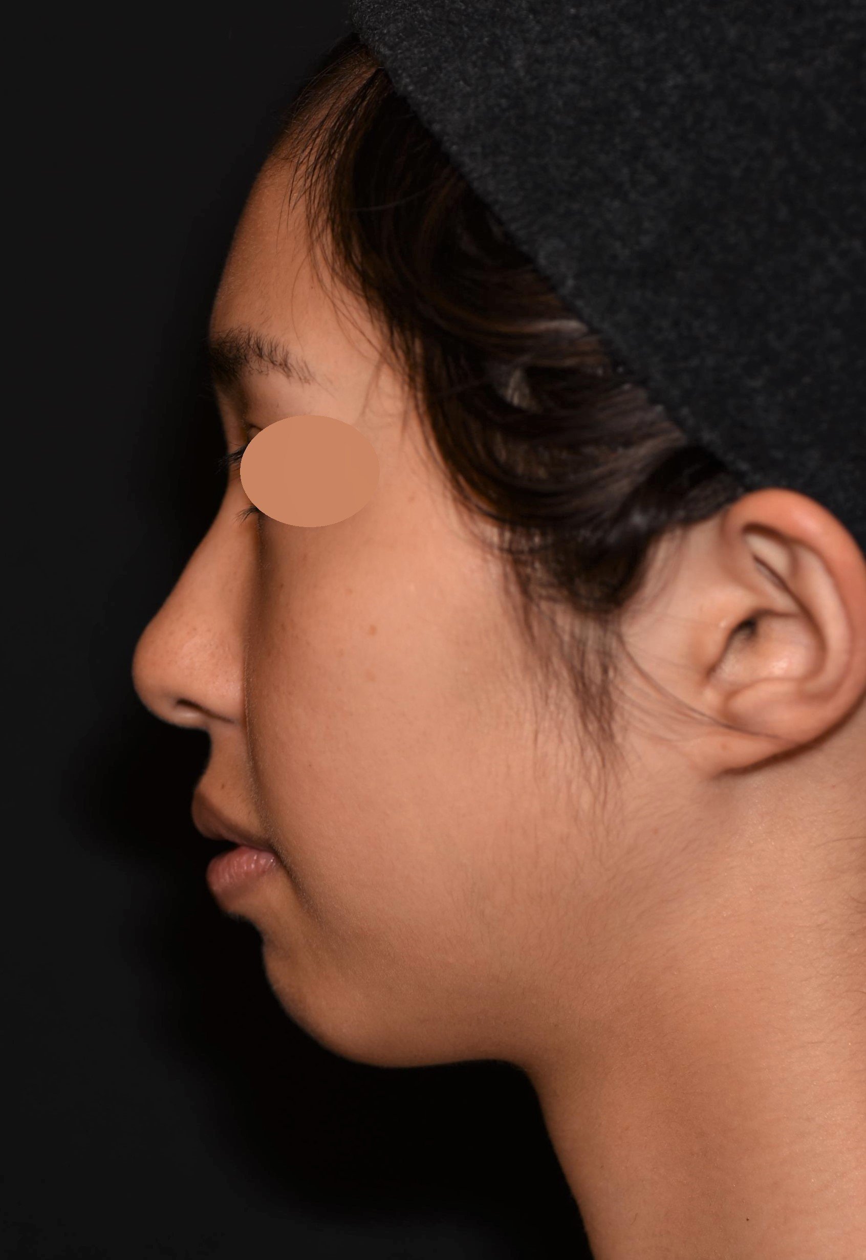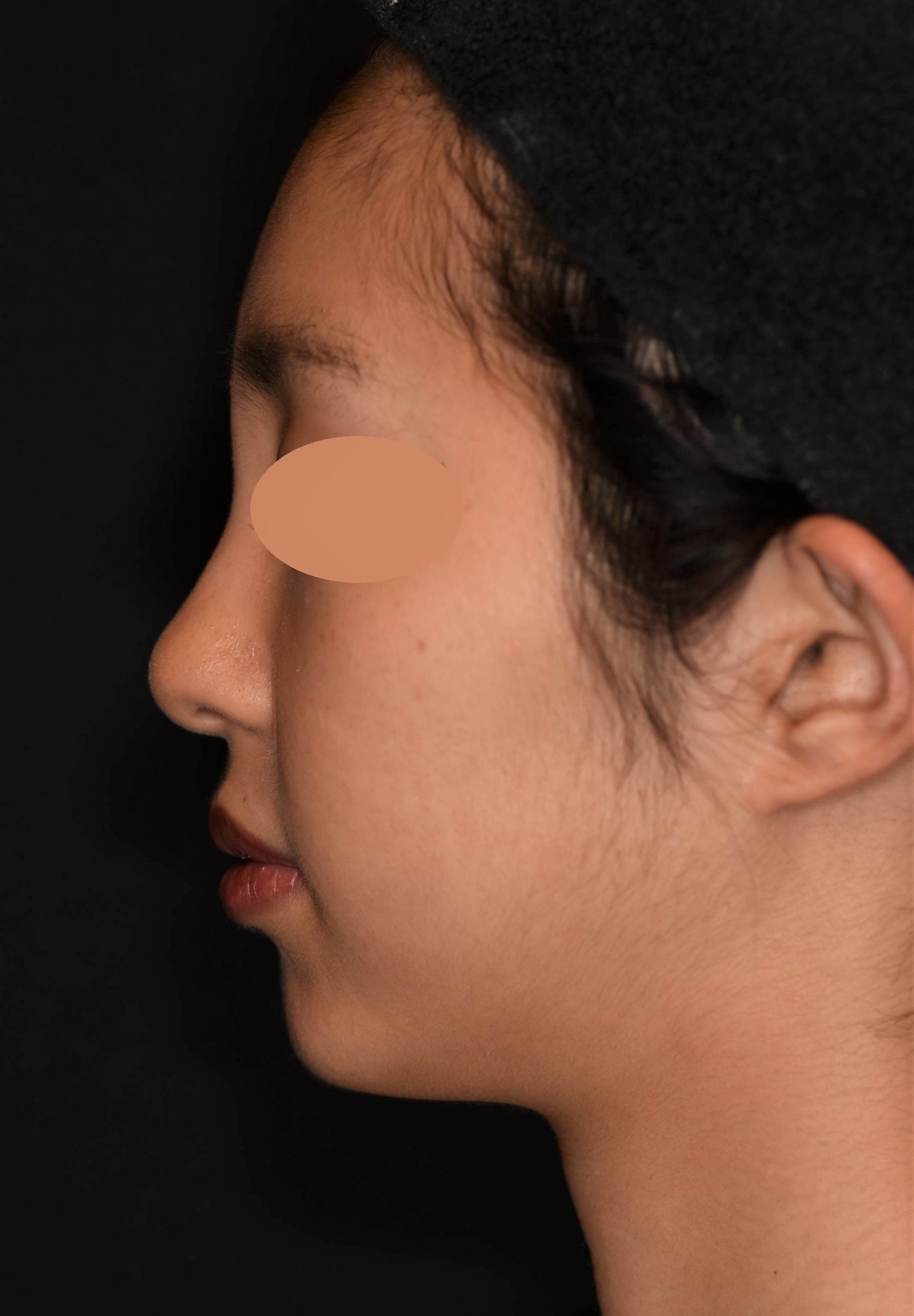 横顔がのっぺり見えることにお悩みでした。日本人は骨格的に鼻根が低い傾向にあり、横から見ると平面的に見えがちです。鼻先の高さはあったので、つけ根にのみに少量注入して鼻筋を通しました。また、あごが小さくやや内側に入り込んでいたので、あごの注入も追加しています。注入後は、鼻、あご、唇が一直線上に位置する「エステティックライン(Eライン)」が整ってどの角度から見ても美しくなりました。あごが形成されたこと輪郭がシャープに見えるので、小顔効果も得られています。横顔にメリハリ感が出て、可愛らしい雰囲気から、華やかで洗練された印象に変わりました。