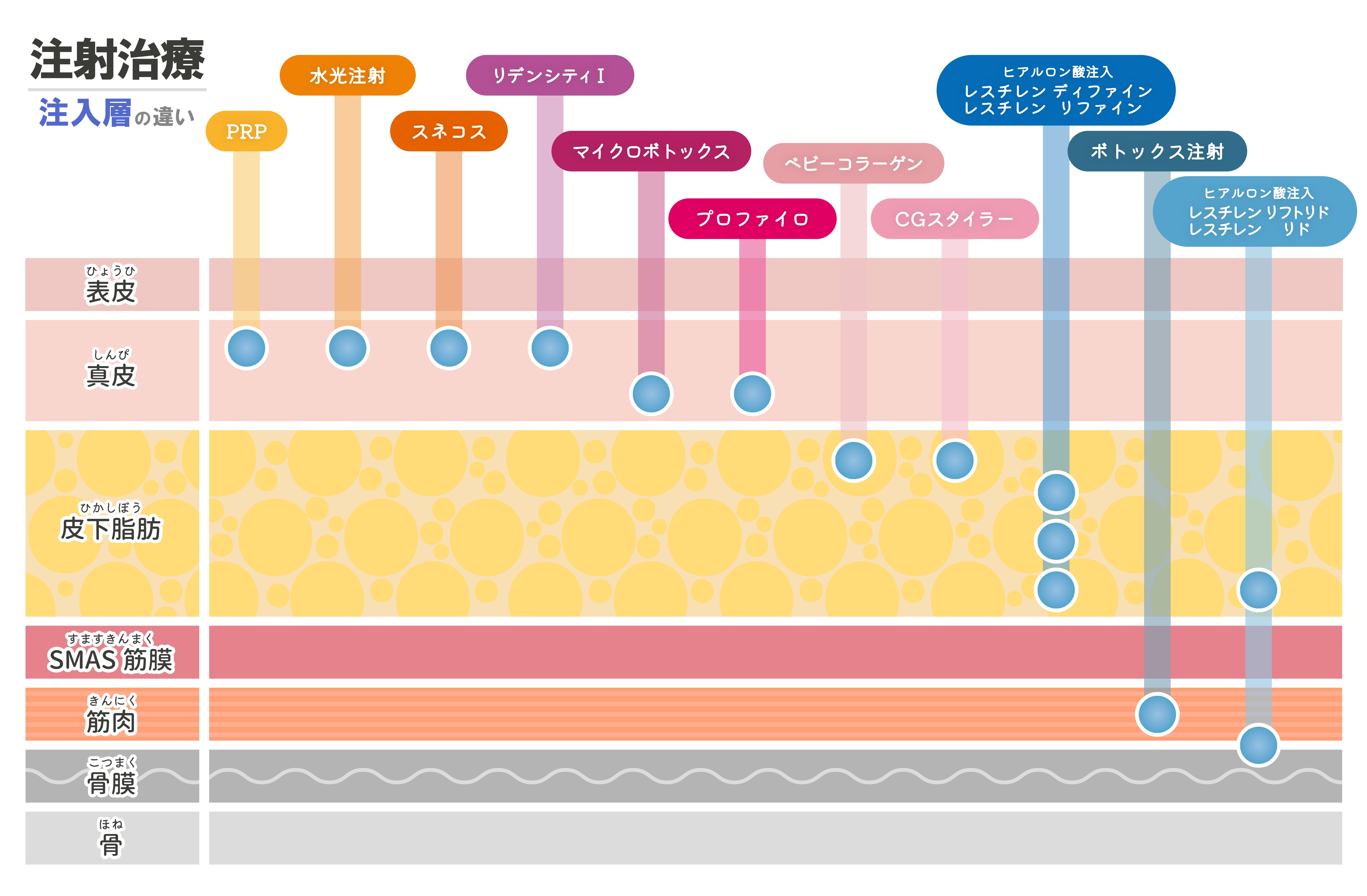 下記の表では、注入治療において各組織層に適した治療法をご紹介しています。実際の治療方針は、肌状態やお悩みを丁寧に診察したうえで、医師が一人ひとりに最適なプランをご提案いたします。