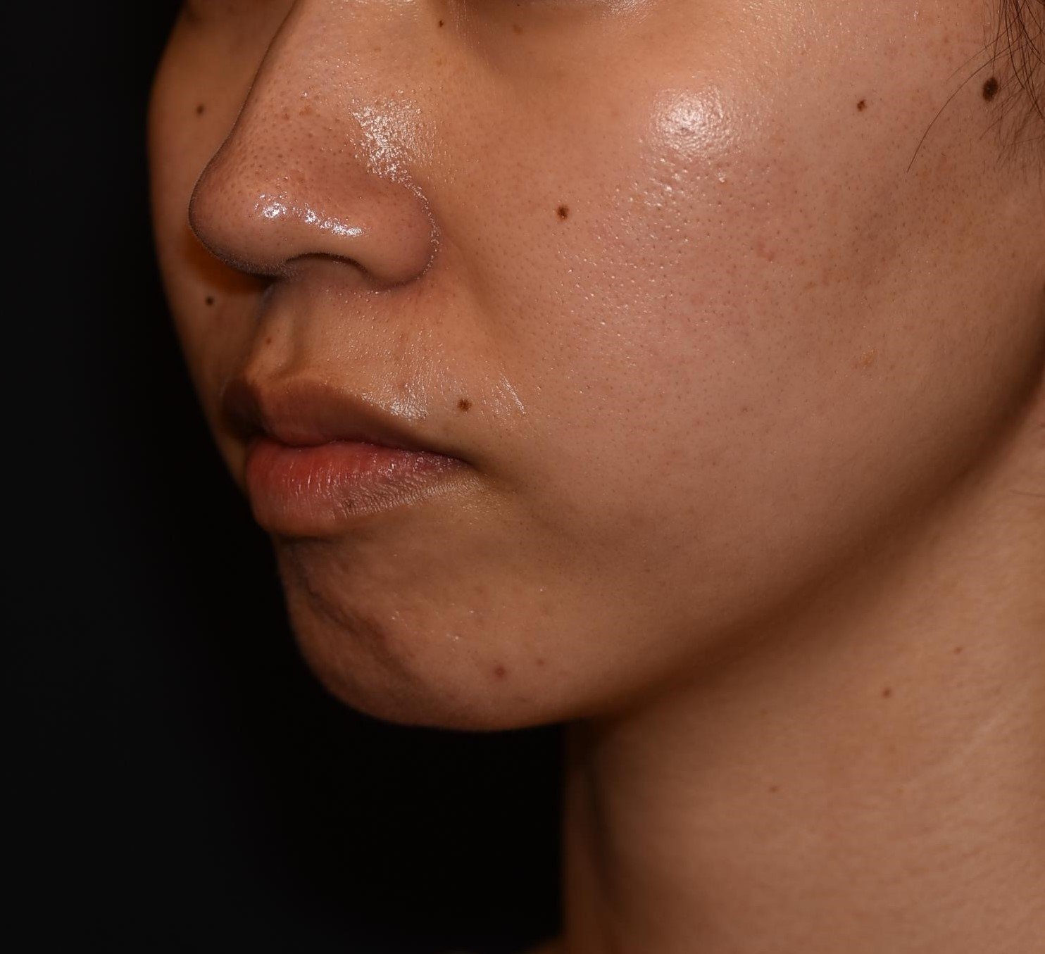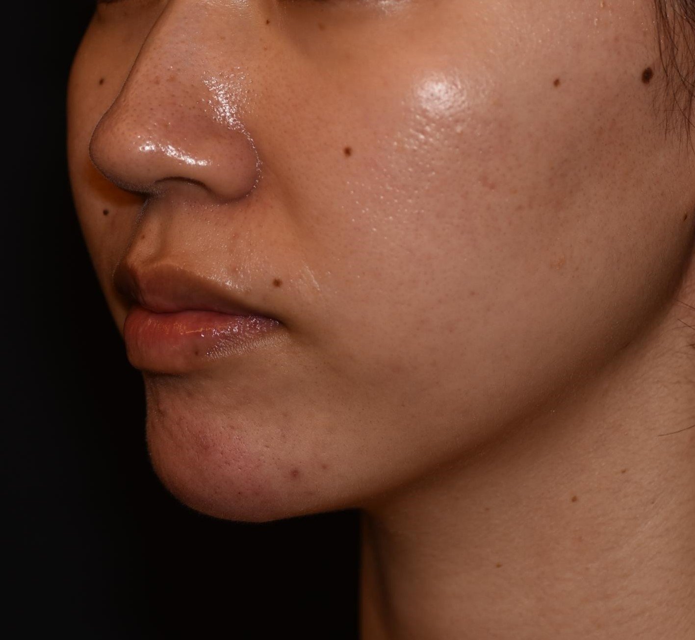 内側に入り込んだ華奢なあごで、オトガイ筋の発達もありボコボコしたシワも目立ちました。また、あご先の左右の骨のずれや脂肪の付き方の違いにより、正面から見た時の輪郭のバランスが悪い状態でした。リフト力の高いヒアルロン酸を骨上に注入することにより、美しくハリのあるあごが形成されました。注入時に、左右のバランスも調整しています。注入後は、鼻、あご、唇が一直線上に位置する「エステティックライン(Eライン)」が整ってどの角度から見ても美しくなりました。元々小顔でしたが、輪郭が整ってさらにシャープに見え、可愛らしさからエレガントな印象に変わっています。