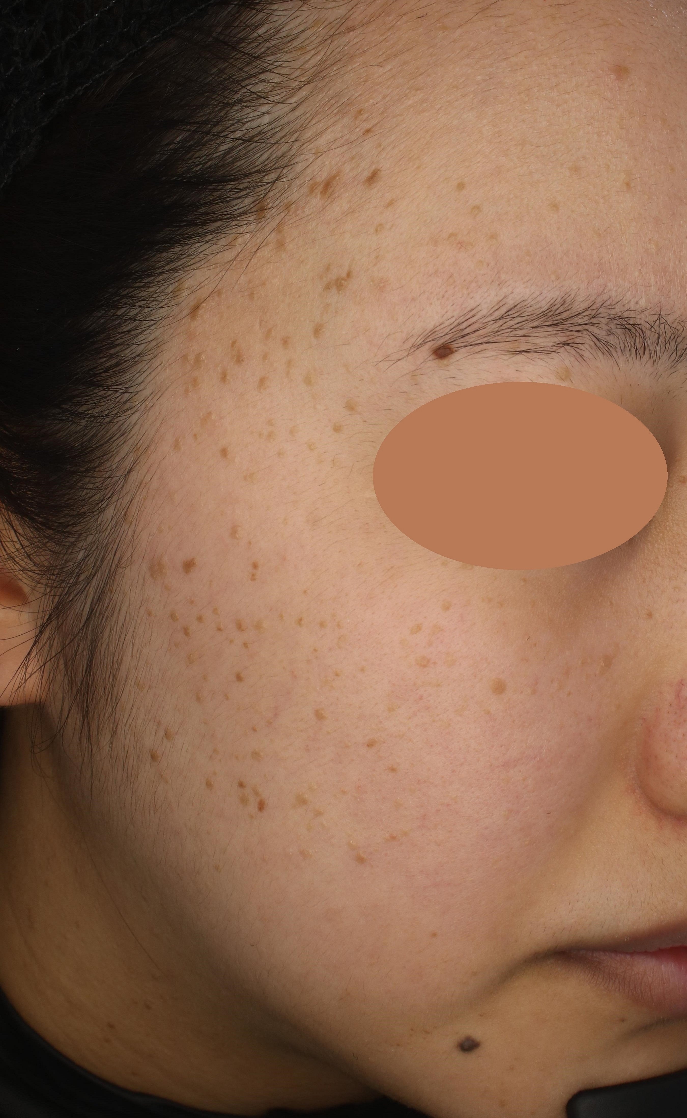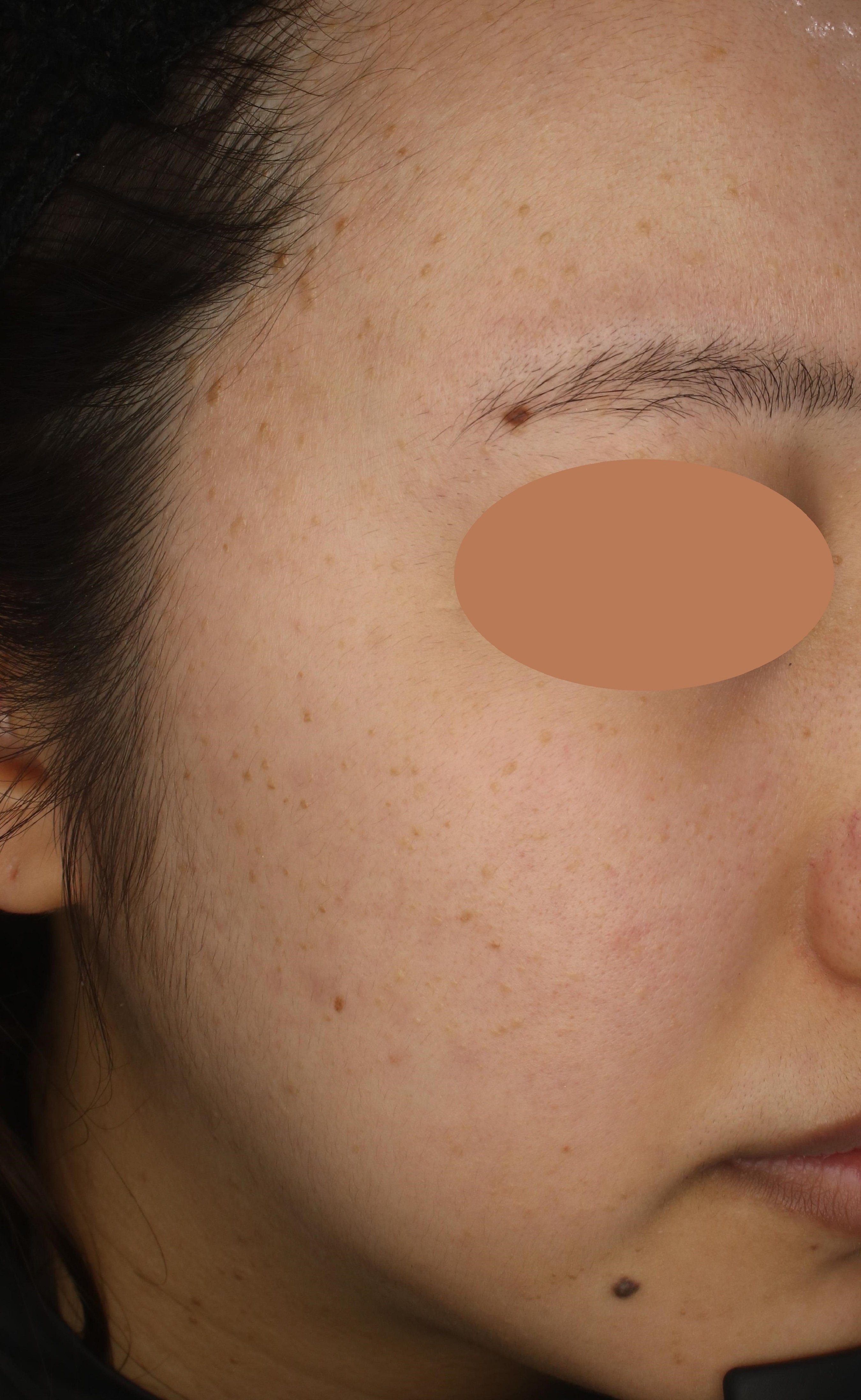 小児期から存在する上下眼瞼縁のほくろの症例です。まずは下眼瞼縁のみの施術を希望されました。サイズが18mmと大きい上、ほくろは深くまで腫瘍細胞が存在するため2回に分けて除去を行い、その後残ったほくろに対して1回追加照射しています。深く削りすぎると隆起や凹みといった痕が残るリスクが高いケースでは、医師があえてわずかにほくろを残し、数回にわけて除去します。手間はかかりますが、安全で美しい仕上がりを重視しているためです。もちろん、良性であることが大前提ですので、まずは皮膚腫瘍の見極め、皮膚科専門医の診断が欠かせません。1回ごとの傷を最小限に抑え、3回の治療でほぼきれいに取り除くことができて、非常に喜んでいただきました。経過をみて、再度色素が目立ってくる場合は再照射をする予定です。