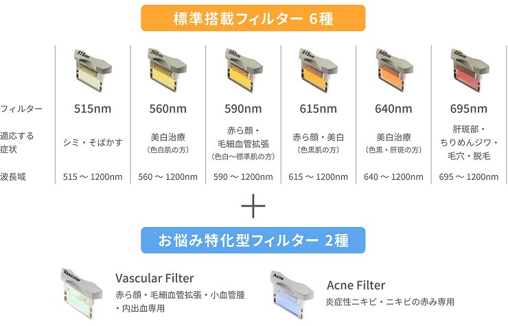 ただし、カットフィルターのうち、「515」「Acne」「Vascular」フィルターは、医薬品医療機器等法上の承認を得ていないものです。