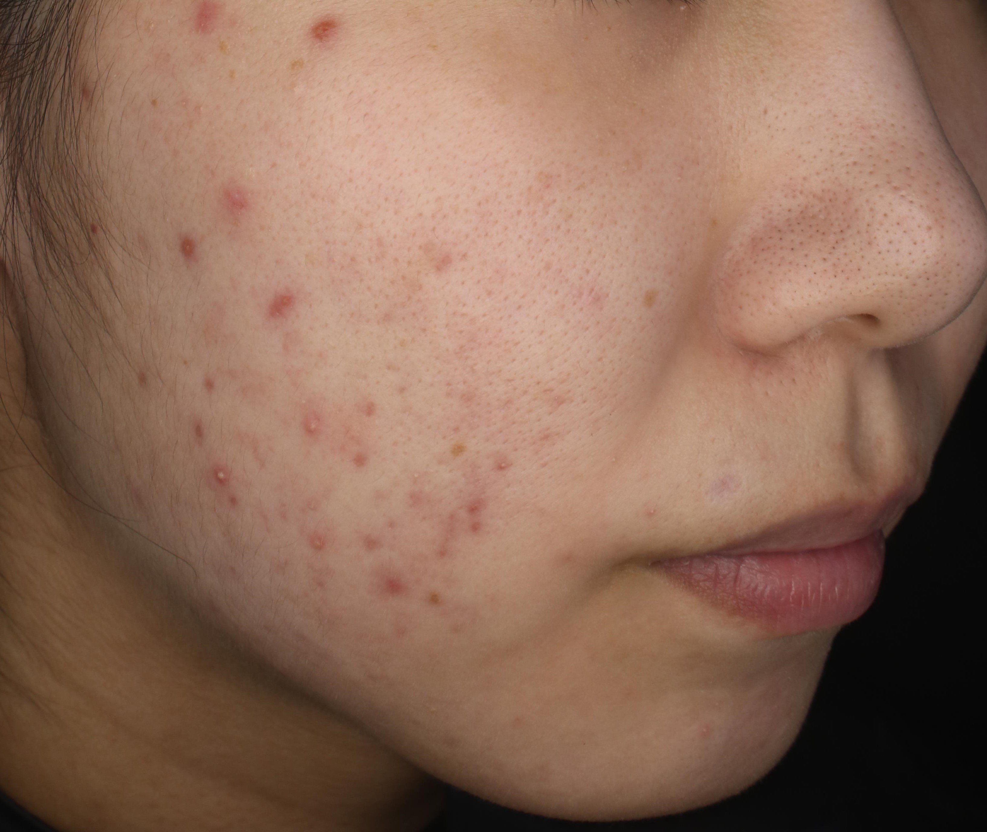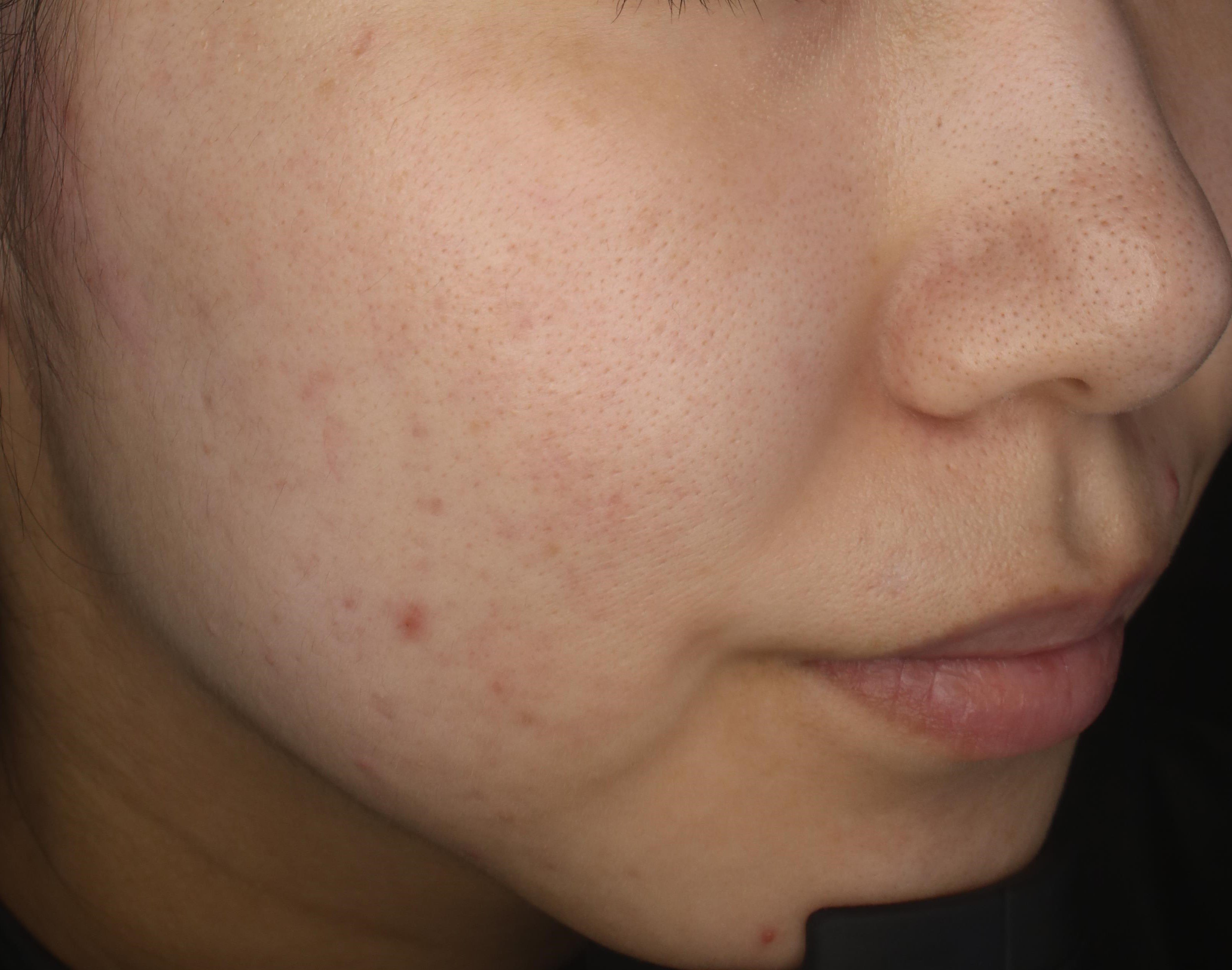 ニキビの初期「白ニキビ(コメド)」は毛穴の浅い部分の皮脂詰まりですが、赤ニキビや黄ニキビは炎症が毛包深部まで広範囲に広がり、炎症が治った後も赤みや黒ずみが3~6か月くらい長く続きます。消えないうちに新しいニキビが出るため、常にニキビだらけな印象になることもあります。この方はニキビ治療目的にフォトフェイシャルM22を5回照射したところ、ニキビが出にくくなり、肌の透明感が高まり、頬の毛穴も引き締まりました。フォトフェイシャルM22は黒、赤どちらの色むらにも効果があるので、ニキビ痕の赤みと黒ずみの両方を軽減します。また、アクネ菌の殺菌作用がある波長領域の光を照射できるモードで照射すると、ニキビの発生自体を抑制できます。当院では乳酸のケミカルピーリング施術とビタミンCとアミノ酸が配合されたローションパックが付くので、毛穴詰まりも改善します。