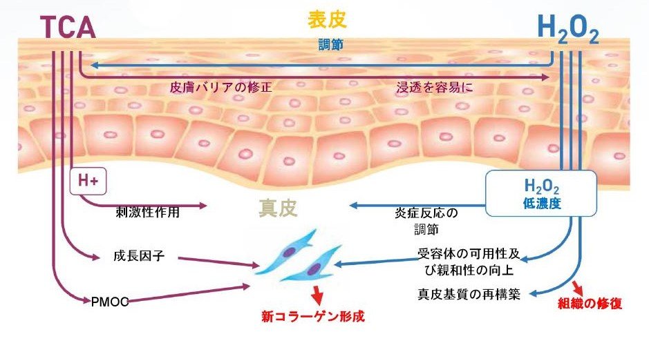 過酸化水素を適切な低濃度にすることが、バイオリバイタライジング作用を促進することが実験により分かっています。PRX-T®33では、低濃度過酸化水素を用いることで、高濃度TCAの表皮での強いピーリング作用を抑制し、ダウンタイム無く、TCA によるコラーゲン再生作用を促進させます。