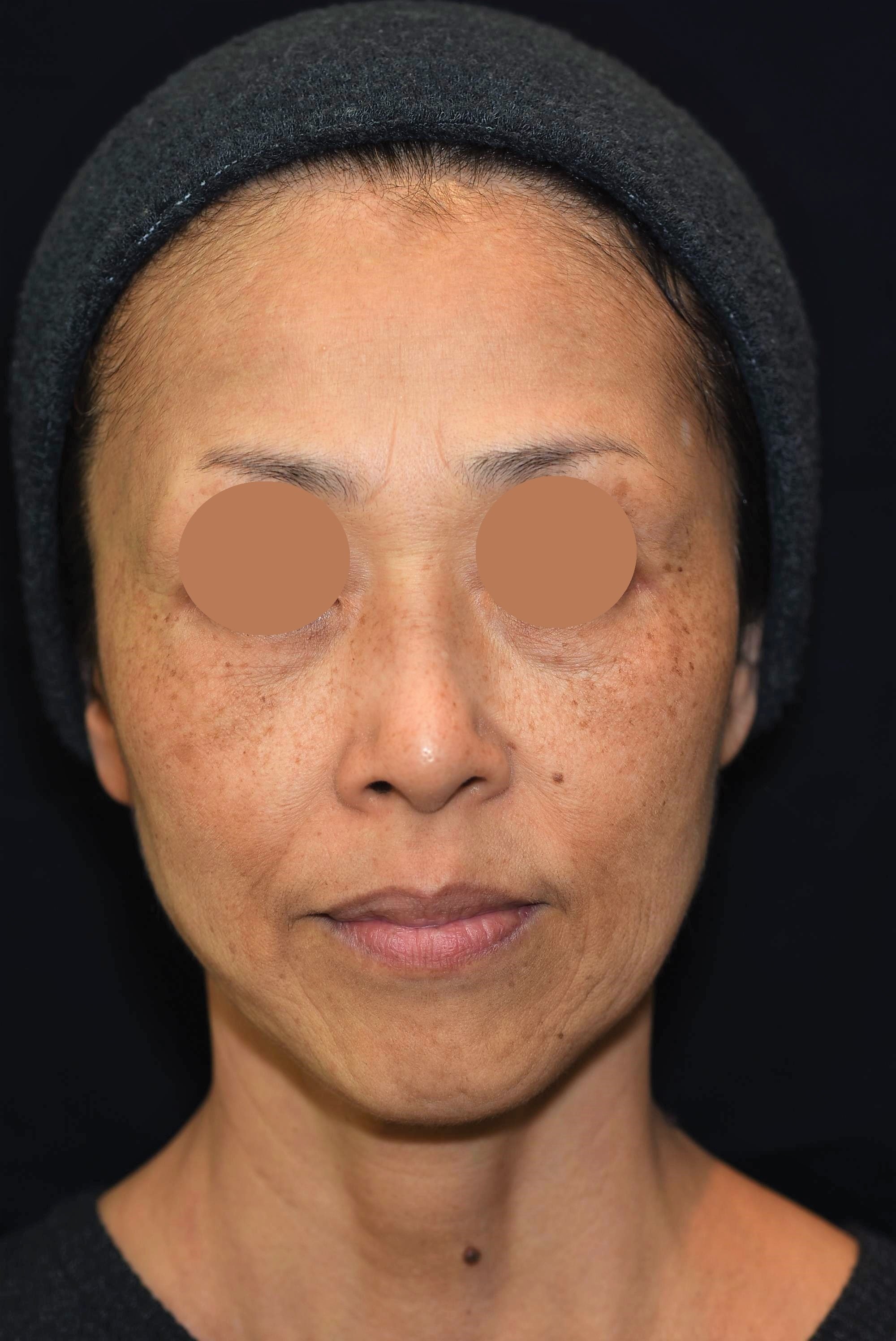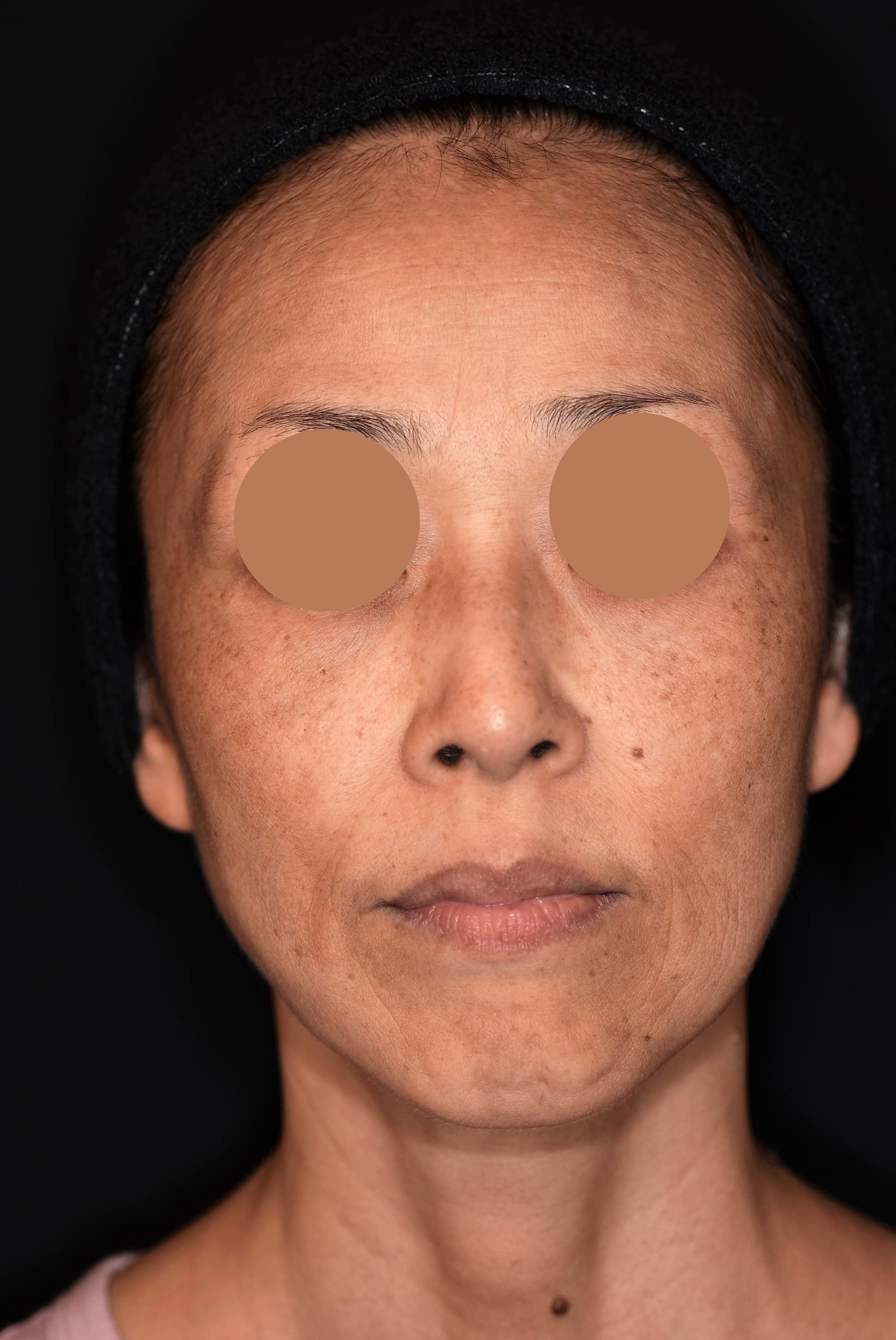 美容治療を受けるのが初めての患者様です。ダウンタイムが無く、気軽にできる治療からスタートしたいとのご要望により、マッサージピールをご案内しました。回数を追う毎にハリが高まり、6回施術後は、特に口周りと目の下のシワが浅くなりました。さらに「コウジ酸」の美白作用により、くすみが払われ肌の明るさ、透明感が上がりました。