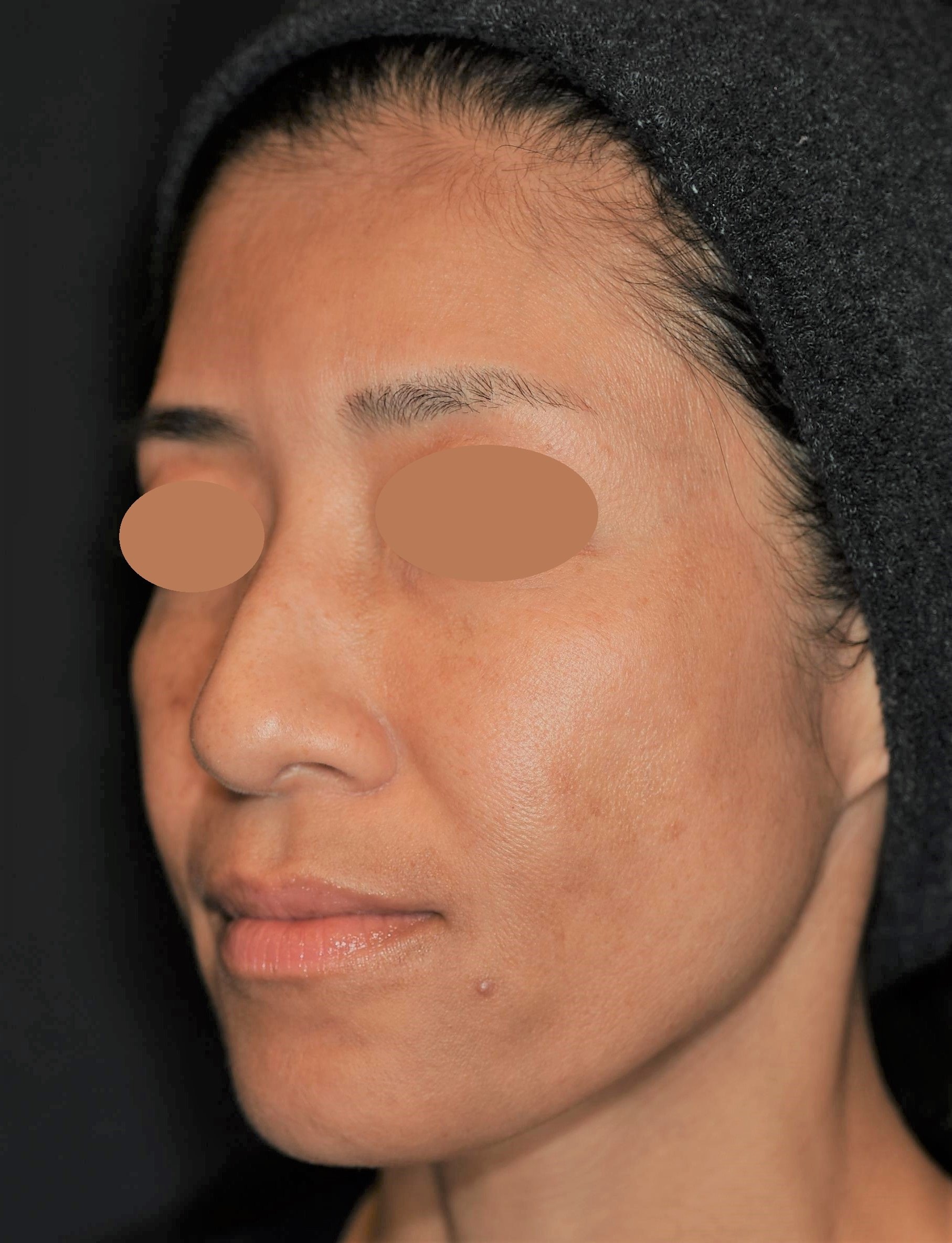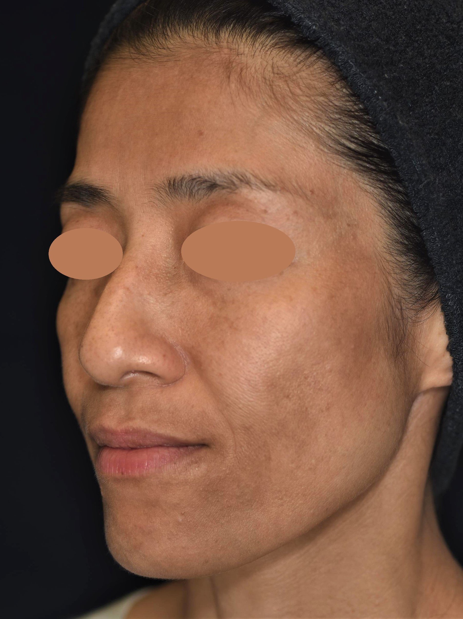 境界がはっきりした左右の大きなシミに対してはピコスポット照射を行いました。1回で綺麗に除去できましたが、施術後に軽い色素沈着が生じたため、ご自宅では美白内服の服用、ターンオーバー促進効果のあるナノメッドVAエッセンス(高濃度レチノール)と、メラニン合成を抑制するHQエッセンス(高浸透型ハイドロキノン)の外用剤を使用いただきながら、顔全体には1ヶ月毎にピコトーニング照射と抗炎症作用の高いトラネキサム酸のイオン導入を全8回行いました。肌の深部に滞留しているメラニンを少しずつ分解・排出するピコトーニング照射は、何度も繰り返し施術を受けることで、徐々に色ムラを目立たなくさせ、肌全体の色調を明るくします。