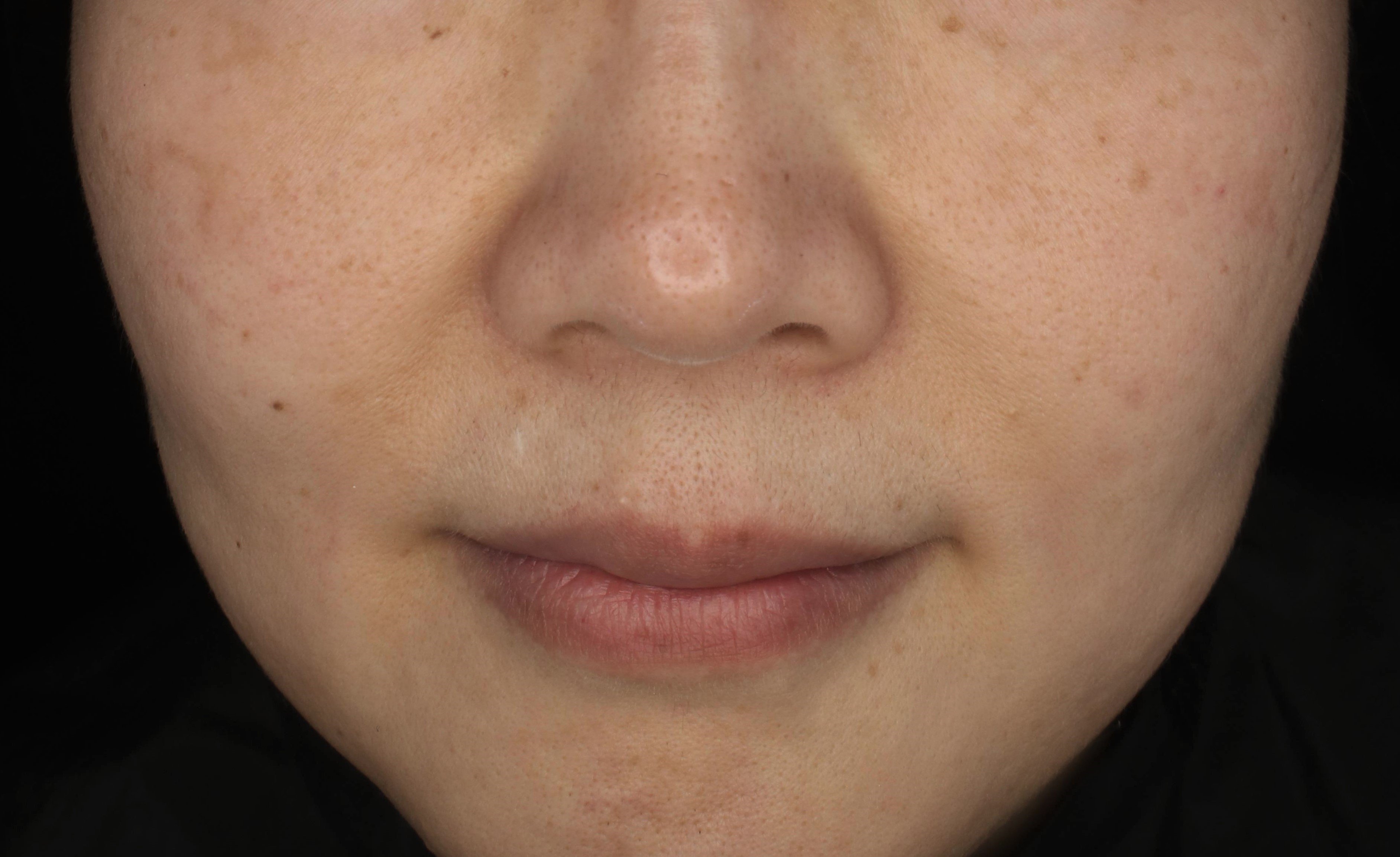 フォトフェイシャルM22を受けていた患者様です。細かく散在していたシミは、回数重ねて目立たなくなり肌色のトーンも上がりましたが、色素沈着が強い口周りから頬外側にかけての色ムラがまだ目立つのと、淡いシミに関しては取り切れず残っている状態でした。ピコトーニングは、肌の中に滞留しているメラニンを一気に微粒子に粉砕します。直後からパンっと顔が白くなり患者様は皆様びっくりされます。2回の照射で色素沈着が強かった口周りの色ムラが改善され、肌色が均一に近づきました。施術前後を比較すると、いかに肌色が見た目年齢や印象を大きく左右しているかが分かります。スポット照射を行った薄いシミも1週間後にはかさぶたが剥がれてキレイに取れました。美白内服と美白剤の外用を併用しているので、照射1ヶ月後以降も色素沈着はなく周囲の皮膚色にもなじみ経過良好です。