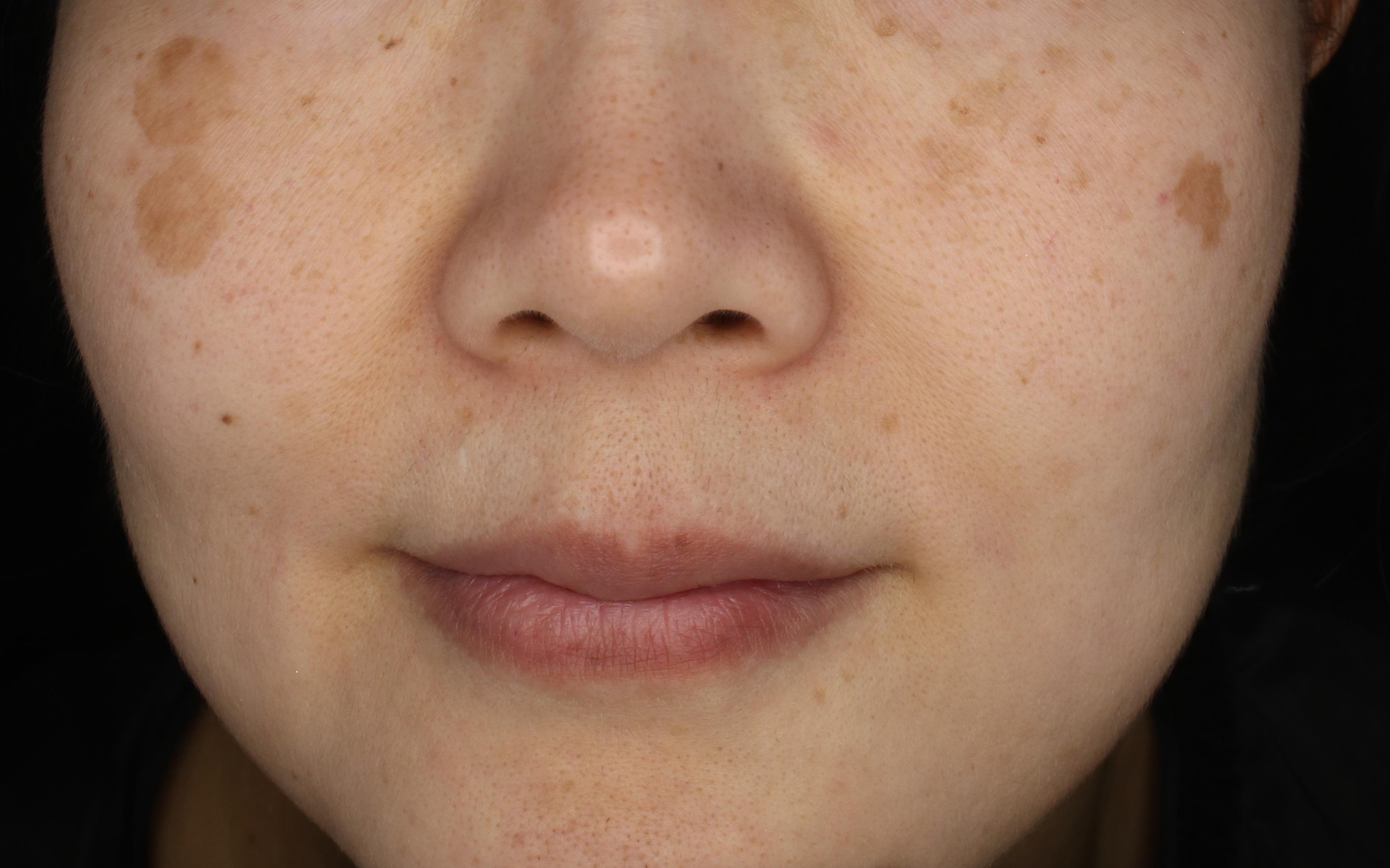 | お悩み | 頬部の大きなシミ・顔全体のくすみ、色むら |