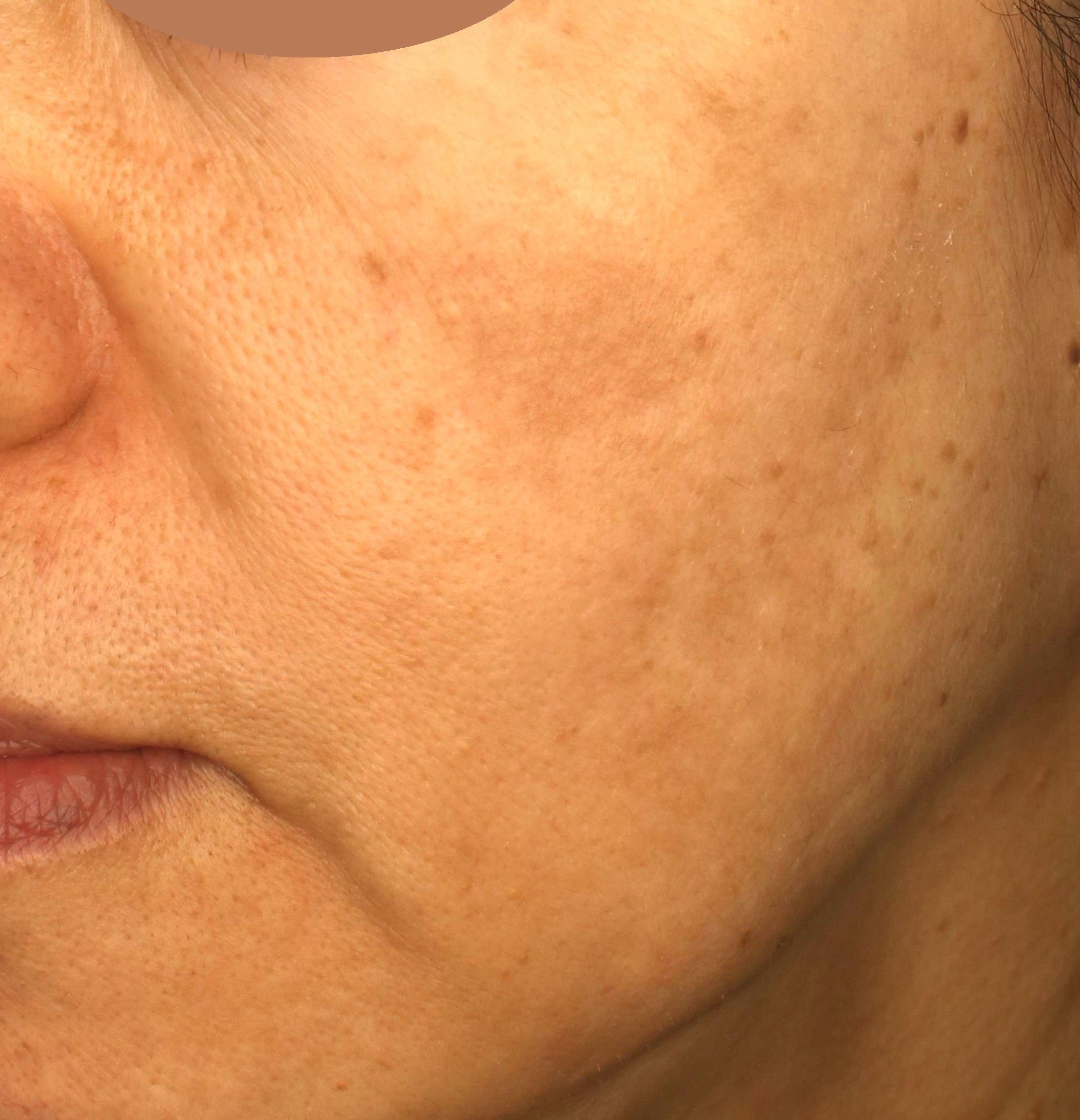 肝斑は不必要にメラニンを作り続けるのが特徴で、難治性の色素性疾患です。最近の研究で、ベースとして、光老化や慢性炎症による「真皮の老化」がメラノサイトの過剰刺激が繰り返す肝斑の原因であることが分かってきました。Angry melanocytesと表現される、異常活性状態のメラノサイトは触れる、擦る、女性ホルモン、紫外線、乾燥などちょっとした刺激で「怒り狂う」「怒りっぽい」メラノサイトなのです。このような真皮の老化を改善する目的で開発されたのが、シルファーム肝斑モードです。怒りっぽいメラノサイトを刺激し続けないように気を付けながら、針とパルス状の高周波を真皮に作用させ、真皮の線維芽細胞を若返らせ健康な細胞外マトリックス(ECM)に整えます。ピコトーニング照射とシルファーム肝斑モード1回で、かなりコントロールが良くなりました。シルファーム肝斑モードでは日光性色素斑は消せませんので、部位によってはピコレーザーでスポット照射を併用する場合もあります。キメと透明感も高まりご満足頂いています。肝斑治療は、定期的なメンテナンスが必要です。肌質にもよりますが、ピコレーザーを3~4か月に1回、その間にシルファーム肝斑モードを2回施術するコンビネーション治療が推奨です。