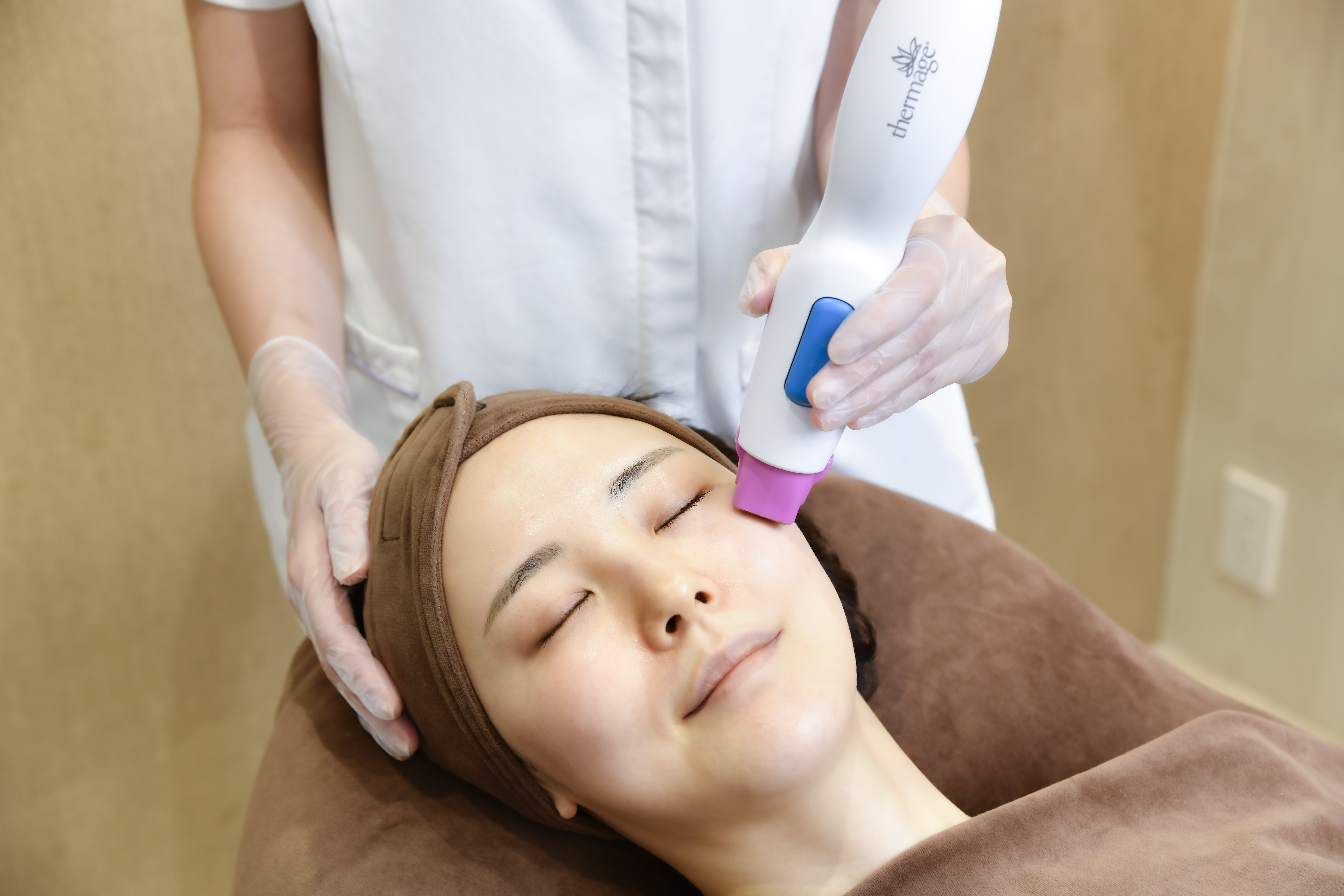 高周波(RF)を用いたたるみ治療器です。当院では、第4世代にあたる最新機種の『サーマクールFLX』を導入しています。高周波の熱エネルギーは、真皮層~脂肪組織~SMAS筋膜まで広範囲に作用し、顔全体のボリュームを「縦」「横」「奥行き」の3次元で引き締めます。これによりダブついた余剰部分を減らして立体的にたるみを改善し、頬やフェイスライン、あご下の輪郭をスッキリ整え、小顔へと導きます。さらに、熱で変性した組織が創傷治癒の過程で新しいコラーゲンを生成するため、肌のハリを高め、小ジワやたるみ毛穴の改善にも効果を発揮します。当院では、 お一人おひとりのたるみの状態を見極めて、照射出力の強弱、重ね打ちのポイント、照射ラインの角度をデザインし、最大限の効果を引き出すオーダーメイド照射を行っています。 また、目元専用の『サーマクールアイ』もご用意しております。眼球を保護する専用コンタクトを装着し、上まぶたまで安全に照射可能です。目周りのゆるみを強力に引き締め、小ジワやたるみが原因のクマにも高い効果を発揮します。加齢でまぶたが重くなった、二重のラインが狭くなった、アイメイクが決まりにくいという方にもおすすめです。