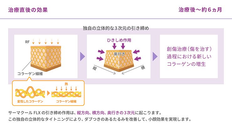 サーマクールFLXは「縦」「横」「奥行き」の3次元で引き締め効果を発揮します。余分なボリュームを立体的に改善し、フェイスラインをスッキリと整えることで、小顔効果へと導きます。