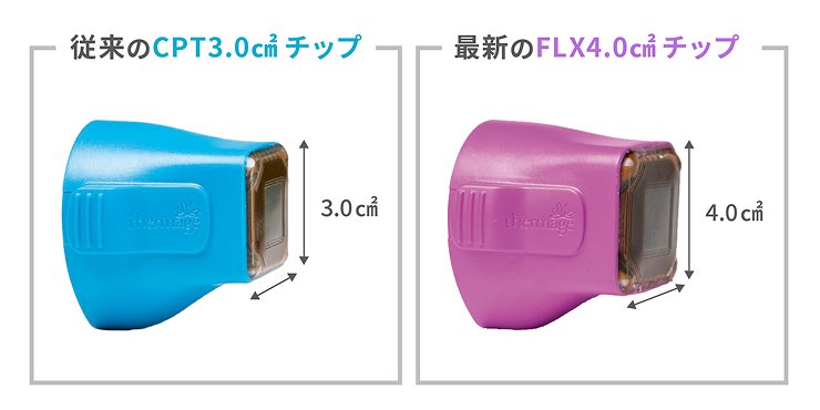 照射チップの大きさがCPTの3.0cm²から4.0cm²へ拡大して、1度に照射できる面積が広がったことで、施術時間は約25%短縮されました。従来のCPTでは顔全体の施術に約400ショットが必要でしたが、FLXでは 約300ショット・30分程度で完了します。