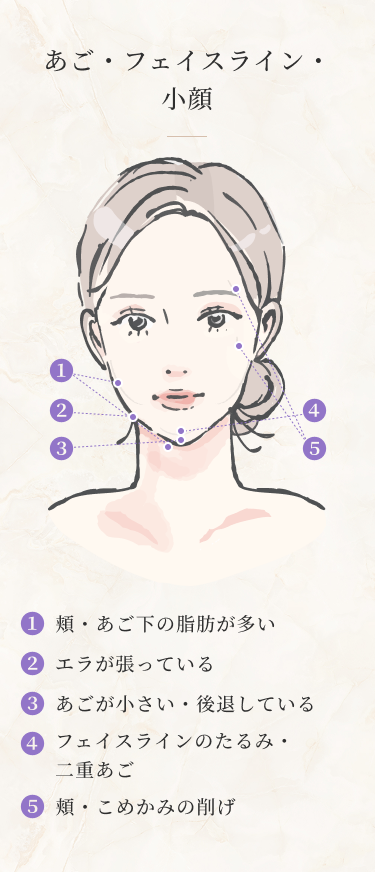 「顔だけが痩せにくい」「フェイスラインがぼやけてきた」「以前のようなシャープな輪郭に戻したい」─こうしたお悩みの背景には、骨格や咬筋の発達、脂肪の位置や量、皮膚のたるみ、さらに加齢による支持靭帯のゆるみなど、複数の要因が複雑に関与していることがあります。そのため、セルフケアや体重変化だけでは改善が難しいと感じられるケースもあります。
