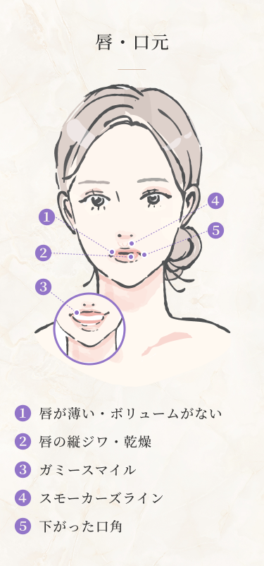 ふっくらとした立体感、自然なツヤ、そしてキュッと上向いた口角。口元は、幸福感や女性らしさを象徴する重要なパーツであり、顔全体の印象を大きく左右します。一方で唇は、年齢変化が現れやすい非常に繊細な部位でもあります。加齢により唇のボリュームが減少すると、縦ジワが目立ちやすくなり、輪郭が曖昧になります。さらに、口周囲には「スモーカーズライン」と呼ばれる細かなシワが現れ、口元全体に疲れた印象や老けた印象を与えてしまうことがあります。また、生まれつき唇が薄い方の場合、口元が寂しげに見えたり、顔全体が平坦な印象になってしまうことも少なくありません。