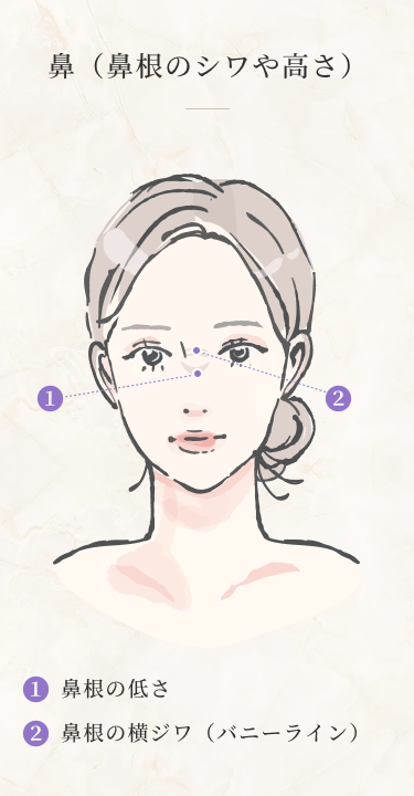 鼻は顔の中心に位置し、表情や雰囲気を大きく左右するパーツです。アジア人は骨格的な特徴から鼻根部に高さが出にくく、正面・横顔ともに立体感が生まれにくい傾向があります。そのため、「大きく印象を変えたいわけではないが、鼻筋にさりげないメリハリがほしい」といったご相談を多くいただきます。また、笑ったり怒ったりといった表情の動きに伴い、鼻の付け根から斜めに入る「バニーライン」と呼ばれる表情ジワが目立つことがあります。バニーラインは年齢とともに深く刻まれやすく、無意識のうちに「疲れている」「不機嫌そう」といった印象を与えてしまうこともあります。